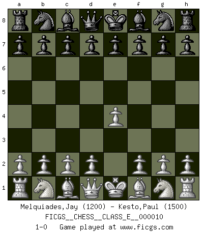 Last move : 1-0 2006 September 28 3:46:26 [Event "FICGS__CHESS__CLASS_E__000010"] [Site "FICGS"] [Date "2006.08.19"] [Round "1"] [White "Melquiades,Jay"] [Black "Kesto,Paul"] [Result "1-0"] [WhiteElo "1200"] [BlackElo "1500"] 1.e4 1-0 This chess game has been lost on time (started : 2006.08.19 0:14:49) King's pawn Opening Player White won this chess game. Follow this game move after move (download)Human affairs are like a Chess game: only those who do not take it seriously can be called good players. (Hung Tzu Ch'eng) Wie kann ich Remis annehmen? Ich weiß ja gar nicht, wie ich stehe! (Fritz Sämisch) No soy una persona materialista y por eso, no resiento la falta o pérdida del dinero. La ausencia de cosas mundanas carece de importancia. Ya que el Ajedrez es una forma en la que puedo ser tan materialista como yo desee sin tener la necesidad de vender mi alma. (Jamie Walter Adams) A ce moment-là, je menaçais de comprendre la position ! (Clément L'Heureux) Whatever you do, don't be bored. This is absolutely the most exciting time we could have possibly hoped to be alive. And things are just starting. (From movie Waking life)