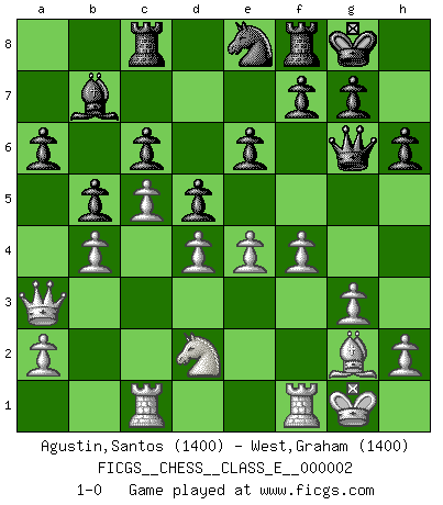 Last move : 1-0 2006 July 27 15:2:57 [Event "FICGS__CHESS__CLASS_E__000002"] [Site "FICGS"] [Date "2006.04.15"] [Round "1"] [White "Agustin,Santos"] [Black "West,Graham"] [Result "1-0"] [WhiteElo "1400"] [BlackElo "1400"] 1.d4 d5 2.Nf3 Nf6 3.g3 c6 4.Bg2 e6 5.O-O Nbd7 6.Bf4 Be7 7.Nbd2 O-O 8.c4 b6 9.Ne5 Bb7 10.Rc1 Rc8 11.Qa4 a6 12.Nxd7 Qxd7 13.Qb3 Qd8 14.c5 b5 15.Qa3 h6 16.Bd6 Ne8 17.Bxe7 Qxe7 18.e4 Qg5 19.f4 Qg6 20.b4 1-0 This chess game has been lost on time (started : 2006.04.15 20:18:24) Queen's pawn game Kingside Castling by player White (move 5) Kingside Castling by player Black (move 7) Player White won this chess game. Follow this game move after move (download)Bobby Fischer is the greatest Chess genius of all time ! (Alexander Kotov) Alle Schachspieler sollten auch ein Hobby haben. (Savielly Grigorievitsch Tartakower) Cuando me preguntan: -¿Cual es el secreto que te hace hacer mejores movidas que tus oponentes?, Yo respondo: Me da gusto que me pregunten eso, porque, como veran, hay una simple razón. Yo pienso mis propias movidas y dejo a mi oponente que el piense las suyas. (Alexander Alekhine) Les Echecs, c'est l'art de la guerre sans les charniers, c'est la résurrection des morts tombés au champ d'honneur, l'espoir perpétuel, la suprématie de l'intelligence sur la force, la culture de l'esprit. (F. Szpiner) War is the child of passion, passion is the child of narcissism and narcissism is the child. (...) Another game ? (Thibault de Vassal)