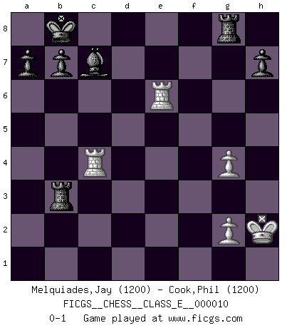 Last move : 0-1 2006 September 2 6:39:58 [Event "FICGS__CHESS__CLASS_E__000010"] [Site "FICGS"] [Date "2006.08.19"] [Round "1"] [White "Melquiades,Jay"] [Black "Cook,Phil"] [Result "0-1"] [WhiteElo "1200"] [BlackElo "1200"] 1.e4 e5 2.Nf3 Nf6 3.Nxe5 Qe7 4.d4 d6 5.Nc4 Nxe4 6.Be3 d5 7.Ne5 Nd7 8.f3 Nd6 9.Nxd7 Bxd7 10.Qe2 Bb5 11.Bg5 Qxe2+ 12.Bxe2 f6 13.O-O fxg5 14.Nc3 c6 15.a4 Ba6 16.Rae1 O-O-O 17.Nb5 cxb5 18.f4 Ne4 19.axb5 Bxb5 20.Bxb5 g4 21.f5 Be7 22.Bd3 g3 23.Bxe4 dxe4 24.hxg3 Rxd4 25.c3 Rc4 26.b3 Rxc3 27.Rxe4 Bc5+ 28.Kh2 Rxb3 29.f6 gxf6 30.Rxf6 Rg8 31.Rfe6 Bb6 32.Rc4+ Kb8 33.g4 Bc7+ 0-1 Petrov's defense Kingside Castling by player White (move 13) Queenside Castling by player Black (move 16) Player Black won this chess game. Follow this game move after move (download)Best by test: 1. e4 (Bobby Fischer) Je älter ich werde, um so mehr schätze ich die Bauern. (Paul Keres) La señal de un Gran Maestro es su habilidad de ganar una partida rápidamente y sin dolor. (Irving Chernev) Il a essayé de se convaincre qu'il pourrait empêcher toutes les erreurs et ne jamais perdre. L'horreur ! Gary Kasparov au sujet de Robert Fischer. Don't be discouraged. It's often the last key in the bunch that opens the lock. (Author unknown)