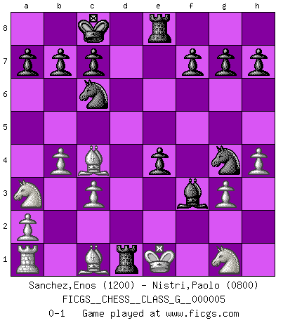 Last move : 0-1 2006 October 22 10:53:14 [Event "FICGS__CHESS__CLASS_G__000005"] [Site "FICGS"] [Date "2006.08.21"] [Round "1"] [White "Sanchez,Enos"] [Black "Nistri,Paolo"] [Result "0-1"] [WhiteElo "1200"] [BlackElo "0800"] 1.g3 d5 2.c3 e5 3.Qa4+ Nc6 4.Qh4 Qxh4 5.gxh4 Nf6 6.Nf3 Bf5 7.Na3 Bc5 8.e3 O-O-O 9.b4 Bd6 10.d3 Rhe8 11.e4 dxe4 12.dxe4 Bxe4 13.Ng1 Bxh1 14.f3 e4 15.Kf2 Bxf3 16.Bc4 Ng4+ 17.Ke1 Bg3+ 18.hxg3 Rd1+ 0-1 Benko's Opening Queenside Castling by player Black (move 8) Player Black won this chess game. Follow this game move after move (download)Chess is a foolish expedient for making idle people believe they are doing something very clever when they are only wasting their time. (George Bernard Shaw) Versuche, dich von der Sklaverei der Eröffnungsvarianten zu befreien. Stattdessen soll man gewisse Typenpositionen erlernen, die man eingehend analysiert. (Aaron Nimzowitsch) Con el fin de mejorar tu juego, debes de estudiar los finales antes que todo, ya que mientras que los finales pueden ser estudiados y dominados por sí mismos, el juegomedio y la apertura deben de ser estudiados en relación con los finales. (José Raúl Capablanca) Assurément je connaissais par expérience le mystérieux attrait de ce jeu royal, le seul entre tous les jeux inventés par les hommes qui échappe souverainement à la tyrannie du hasard, le seul où l'on ne doive sa victoire qu'à son intelligence ou plutôt à une certaine forme d'intelligence. Mais n'est-ce pas déjà le limiter injurieusement que d'appeler les échecs un jeu ? N'est-ce pas une science, un art ou quelque chose qui, comme le cercueil de Mahomet entre ciel et terre, est suspendu entre l'un et l'autre, et qui réunit un nombre incroyable de contraires ? [...] C'est une pensée qui ne mène à rien, une mathématique qui n'établit rien, un art qui ne laisse pas d'uvre, une architecture sans matière; et il l'a prouvé néanmoins qu'il était plus durable, à sa manière, que les livres ou que tout autre monument, ce jeu unique qui appartient à tous les peuples et à tous les temps, et dont personne ne sait quel dieu en fit don à la terre pour tuer l'ennui, pour aiguiser l'esprit et stimuler l'âme. Où commence-t-il, où finit-il ? (Stefan Zweig) Real knowledge is to know the extent of one's ignorance. (Confucius)