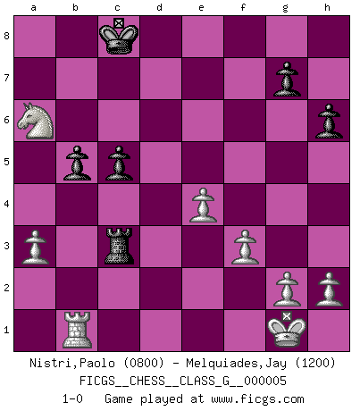 Last move : 1-0 2006 October 12 18:42:36 [Event "FICGS__CHESS__CLASS_G__000005"] [Site "FICGS"] [Date "2006.08.21"] [Round "1"] [White "Nistri,Paolo"] [Black "Melquiades,Jay"] [Result "1-0"] [WhiteElo "0800"] [BlackElo "1200"] 1.e4 e5 2.Nf3 Nc6 3.Bb5 Nge7 4.O-O a6 5.Ba4 b5 6.Bb3 d5 7.d3 dxe4 8.dxe4 Qxd1 9.Rxd1 h6 10.Nc3 f6 11.Be3 Bd7 12.Bc5 O-O-O 13.Bxe7 Bxe7 14.Nh4 Rhe8 15.a3 f5 16.Bf7 Rf8 17.Nxf5 Rxf7 18.Nxe7+ Rxe7 19.Rd2 Nd4 20.Na2 Bc6 21.f3 Red7 22.Nb4 Ne2+ 23.Rxe2 Rd2 24.Rxd2 Rxd2 25.Nxc6 Rxc2 26.Nxe5 Rxb2 27.Nd3 Rb3 28.Nc5 Rc3 29.Nxa6 c5 30.Rb1 1-0 Ruy Lopez : Cozio defense Kingside Castling by player White (move 4) Queenside Castling by player Black (move 12) Player White won this chess game. Follow this game move after move (download)The blunders are all there on the board, waiting to be made. (Savielly Tartakover) Kombinieren und Schwarzhandel gehören verboten. (Savielly Grigorievitsch Tartakower) Una compensación adecuada por un sacrificio es tener una combinación sólida que conduce a una posición ganadora; una compensación adecuada por una metida de pata es dejar a tu oponente arrebatar una derrota de las fauces de la victoria. (Bruce A. Moon) Le profane ne songe pas à la somme de jouissance dont il se prive, qui méconnaît ce jeu aux ressources aussi variées que passionnantes. (Jean-Marie Jeanton-Lamarche) A belief is an idea the mind possesses, an idea that possesses the mind. (Robert Oxden Bolton)