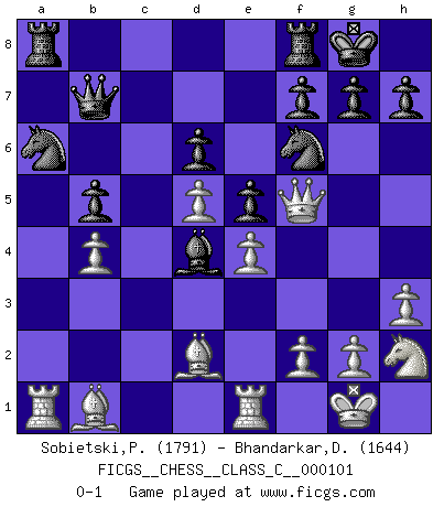 Last move : 0-1 2009 February 21 21:32:56 [Event "FICGS__CHESS__CLASS_C__000101"] [Site "FICGS"] [Date "2008.11.20"] [Round "1"] [White "Sobietski,Piotr"] [Black "Bhandarkar,Dinesh"] [Result "0-1"] [WhiteElo "1791"] [BlackElo "1644"] 1.e4 e5 2.Nf3 Nc6 3.Bb5 a6 4.Ba4 Nf6 5.O-O Be7 6.Re1 b5 7.Bb3 O-O 8.c3 d6 9.h3 Na5 10.Bc2 c5 11.d4 Qc7 12.Nbd2 cxd4 13.cxd4 Bd7 14.Nf1 Rac8 15.Ne3 Nc6 16.d5 Nb4 17.Bb1 a5 18.a3 Na6 19.b4 axb4 20.axb4 Qb7 21.Bd2 Bd8 22.Nh2 Bb6 23.Qf3 Ra8 24.Nf5 Bxf5 25.Qxf5 Bd4 0-1 Ruy Lopez : Closed, 7...O-O Kingside Castling by player White (move 5) Kingside Castling by player Black (move 7) Player Black won this chess game. Follow this game move after move (download)If a ruler does not understand Chess, how can he rule over a kingdom ? (King Khusros II) Pläne sind die Träume des Verständigen. (Ernst Freiherr von Feuchtersleben) Todavía soy una víctima del Ajedrez. Tiene toda la belleza del arte y mucho mas. No puede ser comercializado. El Ajedrez es mas puro que el arte en su posición social. (Marcel Duchamp) D'abord les bases : Jouez et étudiez, puis étudiez et jouez, ensuite jouez et étudiez, puis étudiez et jouez. Deuxièmement : Donnez toujours le meilleur de vous-même ! (Ken Smith) Home computers are being called upon to perform many new functions, including the consumption of homework formerly eaten by the dog. (Doug Larson)