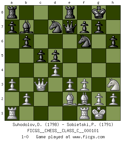 Last move : 1-0 2009 February 22 21:35:35 [Event "FICGS__CHESS__CLASS_C__000101"] [Site "FICGS"] [Date "2008.11.20"] [Round "1"] [White "Suhodolov,Dmitry"] [Black "Sobietski,Piotr"] [Result "1-0"] [WhiteElo "1798"] [BlackElo "1791"] 1.d4 Nf6 2.c4 e6 3.Nc3 Bb4 4.Qc2 O-O 5.a3 Bxc3+ 6.Qxc3 b6 7.Bg5 Bb7 8.f3 h6 9.Bh4 d5 10.e3 Re8 11.Nh3 Nbd7 12.cxd5 exd5 13.Be2 Qe7 14.Bf2 c5 15.O-O 1-0 Nimzo-Indian : Classical variation Kingside Castling by player Black (move 4) Kingside Castling by player White (move 15) Player White won this chess game. Follow this game move after move (download)Castle early and often. (Rob Sillars) Je mehr wir mit Computern analysieren, desto mehr glauben wir an Verteidigung. (Vladimir Kramnik) Un entendimiento a fondo de las continuaciones típicas del mate, hace de las combinaciones de sacrificio mas complicadas conducirlas a ellas no solo sin dificultad, sino casi de una manera natural. (Siegbert Tarrasch) Un journaliste : 'Vous préférez avoir une dame de plus sur l'échiquier ou au lit ?' Boris Spassky : 'Ca dépend de la position.' Somehow our devils are never quite what we expect when we meet them face to face. (Nelson DeMille)