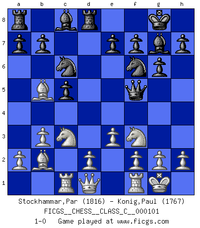 Last move : 1-0 2009 February 22 20:55:44 [Event "FICGS__CHESS__CLASS_C__000101"] [Site "FICGS"] [Date "2008.11.20"] [Round "1"] [White "Stockhammar,Par"] [Black "Konig,Paul"] [Result "1-0"] [WhiteElo "1816"] [BlackElo "1767"] 1.Nf3 Nf6 2.b3 g6 3.Bb2 Bg7 4.e3 c5 5.c4 Nc6 6.Be2 O-O 7.O-O d5 8.cxd5 Qxd5 9.Nc3 Qf5 10.Rc1 Rd8 11.Bb5 1-0 Reti Opening Kingside Castling by player Black (move 6) Kingside Castling by player White (move 7) Player White won this chess game. Follow this game move after move (download)Half the variations which are calculated in a tournament game turn out to be completely superfluous. Unfortunately, no one knows in advance which half. (Jan Tinman) Deine Wertungszahl - vorausgesetzt einige Jahre schachliche Anstrengung - entspricht etwa dem zehnfachen Deines IQ plus 1000. (Jonathan Levitt) El Ajedrez es tan interesante por sí solo, que no es necesario un interés monetario para persuadir a una persona a que lo practique; por lo tanto, nunca se juega por dinero. (Benjamin Franklin) Il n'y a pas de prix trop élevé au scalp de l'ennemi. (Koblentz) We're missing something. (Gregory House, House M.D.)