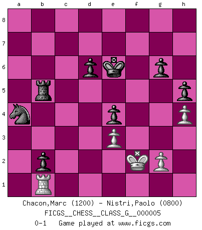 Last move : 0-1 2006 September 21 10:24:18 [Event "FICGS__CHESS__CLASS_G__000005"] [Site "FICGS"] [Date "2006.08.21"] [Round "1"] [White "Chacon,Marc"] [Black "Nistri,Paolo"] [Result "0-1"] [WhiteElo "1200"] [BlackElo "0800"] 1.d4 Nf6 2.c4 d6 3.Nf3 g6 4.Bg5 Bg7 5.e3 O-O 6.Be2 Nbd7 7.O-O b6 8.Nc3 Bb7 9.d5 Nc5 10.Qc2 c6 11.Rfd1 cxd5 12.cxd5 Rc8 13.Bxf6 Bxf6 14.Bb5 Bg7 15.Nd4 Nd7 16.Nc6 Bxc6 17.Bxc6 Nb8 18.Nb5 a6 19.Nd4 e5 20.Nf3 Qe7 21.Nd2 Rc7 22.Qe4 Rfc8 23.Rac1 f5 24.Qd3 e4 25.Qb3 b5 26.Bb7 Rxc1 27.Bxc8 Rxc8 28.Nb1 Rc5 29.a4 Qb7 30.Nc3 Bxc3 31.bxc3 Nd7 32.c4 Rxc4 33.axb5 axb5 34.Rb1 Rc5 35.Rd1 Kf8 36.Qb2 Ne5 37.Rb1 Qxd5 38.Ra1 Ke7 39.h3 h5 40.Ra7+ Kf6 41.Ra1 Ke6 42.Rb1 Qc4 43.Kh2 Qd5 44.Qb3 Qxb3 45.Rxb3 Nd3 46.f3 b4 47.fxe4 fxe4 48.Kg3 Rb5 49.h4 Nc5 50.Rb2 b3 51.Rb1 b2 52.Kf2 Na4 0-1 Old Indian defense Kingside Castling by player Black (move 5) Kingside Castling by player White (move 7) Player Black won this chess game. Follow this game move after move (download)Kasparov : J'adoube , Ivanchuk : S'il vous plaît ! (Garry Kasparov & Vassily Ivanchuk, Linares 1997) Es hat in meinem Leben Zeiten gegeben, da ich sehr nahe daran war zu glauben, daß ich auch nicht eine einzige Schachpartie verlieren könnte. (José Raúl Capablanca) Existen dos clases de sacrificios: los correctos y los mÃos. (Mikhail Tal) Ce qui est bien, c'est d'avoir tout un tas de pièces en prise : l'adversaire ne peut en prendre qu'une à la fois. Cité par Thierry Audin. Without deviation from the norm, progress is not possible. (Frank Zappa)