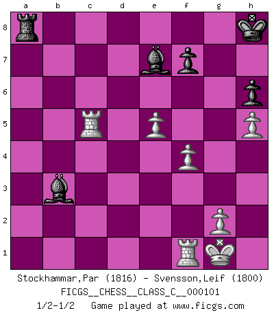 Last move : 1/2-1/2 2009 September 27 19:19:29 [Event "FICGS__CHESS__CLASS_C__000101"] [Site "FICGS"] [Date "2008.11.20"] [Round "1"] [White "Stockhammar,Par"] [Black "Svensson,Leif"] [Result "1/2-1/2"] [WhiteElo "1816"] [BlackElo "1800"] 1.Nf3 Nf6 2.b3 d5 3.Bb2 c5 4.e3 e6 5.c4 Nc6 6.cxd5 exd5 7.Be2 Bd6 8.O-O O-O 9.d4 cxd4 10.Nxd4 Re8 11.Nb5 Bb8 12.Nd2 a6 13.Nd4 Bd6 14.Rc1 Bd7 15.Nxc6 bxc6 16.Qc2 a5 17.Rfd1 h6 18.Bd3 Rb8 19.h3 c5 20.Bf5 Bb5 21.Nb1 a4 22.Bxf6 Qxf6 23.Nc3 axb3 24.axb3 Re5 25.e4 g6 26.Nxd5 Rxd5 27.Rxd5 gxf5 28.Qd2 Be7 29.Rxf5 Qg7 30.Re1 Rd8 31.Rd5 Rc8 32.Qf4 Qg6 33.h4 Bc6 34.h5 Qg7 35.Rd3 Kh8 36.Rf3 Be8 37.Rg3 Bg5 38.Qf5 Rc7 39.e5 Bd7 40.Qd3 Qf8 41.Qe4 Ra7 42.Rd1 Be6 43.f4 Bh4 44.Rc3 Qa8 45.Qxa8+ Rxa8 46.Rxc5 Bxb3 47.Rf1 Be7 1/2-1/2 Reti Opening Kingside Castling by player White (move 8) Kingside Castling by player Black (move 8) This chess game ended in a draw. Follow this game move after move (download)I give 98 percent of my mental energy to Chess. Others give only 2 percent. (Bobby Fischer) Dein Körper muss in Topform sein. Dein Schach verfällt, wenn dein Körper verfällt. Der Körper kann nicht vom Geist getrennt werden. (Robert James Fischer) Tu no necesitas jugar muy bien, únicamente ayudar a tu oponenet a que juegue muy mal. (Genrikh Chepukaitis) Les Echecs mettent en conflit, non pas deux intelligences, mais deux volontés. (Lasker) The difference between stupidity and genius is that genius has its limits. (Murphy)
