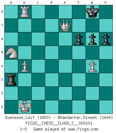 Last move : 1-0 2009 February 14 13:23:35 [Event "FICGS__CHESS__CLASS_C__000101"] [Site "FICGS"] [Date "2008.11.20"] [Round "1"] [White "Svensson,Leif"] [Black "Bhandarkar,Dinesh"] [Result "1-0"] [WhiteElo "1800"] [BlackElo "1644"] 1.e4 e5 2.Nf3 Nc6 3.d4 exd4 4.Nxd4 Nf6 5.Nc3 Bb4 6.Nxc6 bxc6 7.Bd3 d5 8.exd5 cxd5 9.O-O O-O 10.Bg5 c6 11.Na4 h6 12.Bh4 Bd6 13.Re1 Rb8 14.c3 c5 15.b3 Be6 16.Qf3 Re8 17.Bf5 Bxf5 18.Qxf5 Qd7 19.Qxd7 Nxd7 20.Red1 d4 21.Bg3 Bxg3 22.hxg3 Nf6 23.cxd4 cxd4 24.Rxd4 Re2 25.Nc3 Rc2 26.Nd1 Re8 27.Ne3 Rb2 28.Ra4 Re7 29.Rc1 Rd7 30.g4 R7d2 31.Nc4 Rbc2 32.Rxc2 Rxc2 33.f3 Nd5 34.Rxa7 Nf4 35.a4 Nxg2 36.Rd7 Nh4 37.Rd3 Ng6 38.Rd8+ Kh7 39.a5 Ra2 40.Rd2 Ra1+ 41.Kf2 Nf4 42.Rd7 f6 43.Ke3 Ne6 44.b4 Ra4 45.Rb7 Nd8 46.Rb6 Nf7 47.a6 Ng5 48.Na5 Ra3+ 49.Kf2 Rxf3+ 50.Ke2 Ra3 51.a7 Ra2+ 52.Kd3 Ra3+ 53.Kc2 Ra2+ 54.Kb1 Ra3 55.a8Q Ne4 56.Qxe4+ g6 57.Qe7+ Kg8 58.Rb8+ 1-0 Scotch : Schmidt variation Kingside Castling by player White (move 9) Kingside Castling by player Black (move 9) Promotion Queen by player White (move 55) Player White won this chess game. Follow this game move after move (download)I prefer to lose a really good game than to win a bad one. (David Levy) Die Partien sind immer verschieden, die Interviews immer die gleichen. (Garry Kasparov) El Ajedrez es un cuento de Hadas de las 1001 metidas de pata. (Savielly Tartakower) Si je n'étais pas joueur d'échecs, je serais le meilleur dans quelque chose d'autre. (Anatoli Karpov) Information on the Internet is subject to the same rules and regulations as conversation at a bar. (George Lundberg)