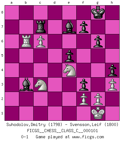 Last move : 0-1 2009 November 16 8:58:43 [Event "FICGS__CHESS__CLASS_C__000101"] [Site "FICGS"] [Date "2008.11.20"] [Round "1"] [White "Suhodolov,Dmitry"] [Black "Svensson,Leif"] [Result "0-1"] [WhiteElo "1798"] [BlackElo "1800"] 1.d4 Nf6 2.c4 c5 3.d5 e5 4.Nc3 d6 5.e4 Be7 6.h3 h5 7.Be2 h4 8.Be3 Nbd7 9.Nf3 Nf8 10.O-O Ng6 11.a3 b6 12.b4 O-O 13.Qd2 Nd7 14.Rab1 a5 15.Rb2 axb4 16.axb4 cxb4 17.Rxb4 Nc5 18.Rfb1 Ra6 19.Qb2 Nf4 20.Bxf4 exf4 21.Rxb6 Bf6 22.Rxa6 Bxa6 23.e5 dxe5 24.Qc2 Bc8 25.Bd3 g6 26.Rb5 Nxd3 27.Qxd3 Bg7 28.c5 Ba6 29.c6 Qc7 30.Qc4 Bf6 31.Nd2 Be7 32.Nde4 Rc8 33.Qb3 f3 34.Rb6 Bc4 35.d6 Bxb3 36.dxc7 Rxc7 0-1 This chess game has been lost on time (started : 2008.11.20 11:26:49) Czech Benoni defense Kingside Castling by player White (move 10) Kingside Castling by player Black (move 12) Player Black won this chess game. Follow this game move after move (download)War is the child of passion, passion is the child of narcissism and narcissism is the child. (...) Another game ? (Thibault de Vassal) Ich habe die besten Aussichten, den ersten Preis zu gewinnen - denn jeder muss gegen Steinitz spielen, nur ich nicht! (Wilhelm Steinitz) Yo tuve un dolor de muelas en la primer partida. En el segundo juego, tuve un dolor de cabeza. En el tercero, tuve un ataque de reumatísmo. En la cuarta partida, no me sentía muy bien. ¿Y en el quinto juego? Bueno, ¿que acaso uno tiene que ganar todos los juegos?. (Siegbert Tarrasch) Les échecs sont utiles à l'exercice de la faculté de penser et à celle de l'imagination. Car nous devons posséder une méthode élaborée pour atteindre des buts partout où nous devons conduire notre raison. (Leibnitz) A specialist learns more and more about less and less until he knows everything about nothing. (Nicholas Murray Butler)