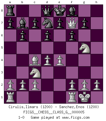 Last move : 1-0 2006 September 2 4:26:12 [Event "FICGS__CHESS__CLASS_G__000005"] [Site "FICGS"] [Date "2006.08.21"] [Round "1"] [White "Cirulis,Ilmars"] [Black "Sanchez,Enos"] [Result "1-0"] [WhiteElo "1200"] [BlackElo "1200"] 1.e4 d6 2.Nc3 Nd7 3.Nf3 b6 4.Bc4 Bb7 5.O-O h5 6.d4 Rh6 7.Bxh6 Nxh6 8.Ng5 f6 9.Qxh5+ Nf7 10.Qxf7+ 1-0 Comment by player 2 : Enos Sanchez : good game King's pawn Opening Kingside Castling by player White (move 5) Player White won this chess game. Follow this game move after move (download)Chess books should be used as we use glasses: to assist the sight, although some players make use of them as if they thought they conferred sight. (Jose Raul Capablanca) Gegen einen Schachcomputer zu verlieren ist wie Löcher in den Strümpfen zuhaben. Es ist nicht peinlich, solange man der einzige ist der es weiß. (Anonymous) La única cosa que los jugadores de Ajedrez tienen en común, es el Ajedrez. (Lodewijk Prins) Vouloir jouer aux échecs contre soi-même est aussi paradoxal que vouloir marcher sur son ombre. (Stefan Zweig) Coffee just isn't my cup of tea. (Unknown)