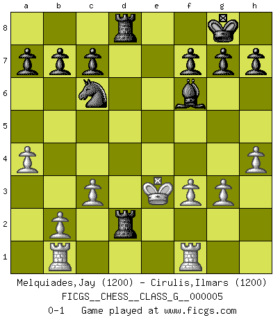 Last move : 0-1 2006 September 6 19:13:44 [Event "FICGS__CHESS__CLASS_G__000005"] [Site "FICGS"] [Date "2006.08.21"] [Round "1"] [White "Melquiades,Jay"] [Black "Cirulis,Ilmars"] [Result "0-1"] [WhiteElo "1200"] [BlackElo "1200"] 1.e4 Nc6 2.c3 d5 3.d3 Nf6 4.h3 dxe4 5.dxe4 Qxd1+ 6.Kxd1 Nxe4 7.Ke2 e5 8.Nf3 Be6 9.g3 Bc4+ 10.Ke3 Bd5 11.Nbd2 Bc5+ 12.Ke2 Nxd2 13.Bxd2 e4 14.Ng5 e3 15.Bxe3 Bxe3 16.f3 Bxg5 17.Rd1 Bc4+ 18.Kf2 Bxf1 19.Rhxf1 O-O 20.h4 Bf6 21.a4 Rad8 22.Rb1 Rd2+ 23.Ke3 Rfd8 0-1 KP : Nimzovich defense Kingside Castling by player Black (move 19) Player Black won this chess game. Follow this game move after move (download)One bad move nullifies forty good ones. (Horowitz) Spiel ein langweiliges Spiel zu Ende und lustige Dinge können passieren. (Hans Ree) El Ajedrez, como cualquier actividad creativa, solo puede existir a través del esfuerzo combinado de aquellos que tienen talento creativo y de aquellos que poseen la habilidad de organizar su trabajo creativo. (Mikhail Botvinnik) J'ai toujours senti une vague pitié pour l'homme qui ne connaît rien aux échecs, tout comme j'en aurais pour un homme ignorant de l'amour. Les Echecs, comme la musique ou comme l'amour, ont le pouvoir de rendre heureux. (Siegbert Tarrasch) There are lots of people who mistake their imagination for their memory. (Josh Bilings)