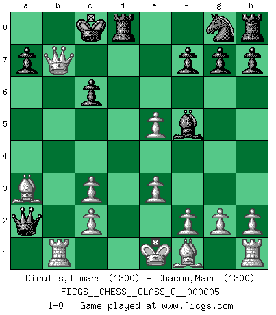 Last move : 1-0 2006 September 7 10:29:15 [Event "FICGS__CHESS__CLASS_G__000005"] [Site "FICGS"] [Date "2006.08.21"] [Round "1"] [White "Cirulis,Ilmars"] [Black "Chacon,Marc"] [Result "1-0"] [WhiteElo "1200"] [BlackElo "1200"] 1.Nc3 d5 2.Nf3 Nc6 3.e3 e5 4.d4 Bb4 5.Nxe5 Nxe5 6.dxe5 Qe7 7.Qxd5 Bxc3+ 8.bxc3 c6 9.Qa5 Bf5 10.Ba3 Qe6 11.Rb1 Qxa2 12.Qb4 O-O-O 13.Qxb7+ 1-0 Dunst (Sleipner, Heinrichsen) Opening Queenside Castling by player Black (move 12) Player White won this chess game. Follow this game move after move (download)A Chess game is a dialogue, a conversation between a player and his opponent. Each move by the opponent may contain threats or be a blunder, but a player cannot defend against threats or take advantage of blunders if he does not first ask himself: What is my opponent planning after each move ? (Bruce A. Moon) Er war ein guter Schachspieler, aber ich kann Leute nicht ausstehen, die 'Heil Hitler' rufen (Über Alexander Aljechin). (Miguel Najdorf) Sin errores no puede haber brillantez. (Emanuel Lasker) Vous savez, camarade Pachman, je n'éprouve pas de plaisir à être ministre, je jouerais plutôt aux échecs comme vous, ou alors ferais une révolution au Venezuela. (Che Guevara à Ludek Pachman, 'Checkmate in Prague', 1975) The message for business people contemplating their place in the cyberspace is simple and direct: get linked or get lost. (Vic Sussman and Kenan Pollack)