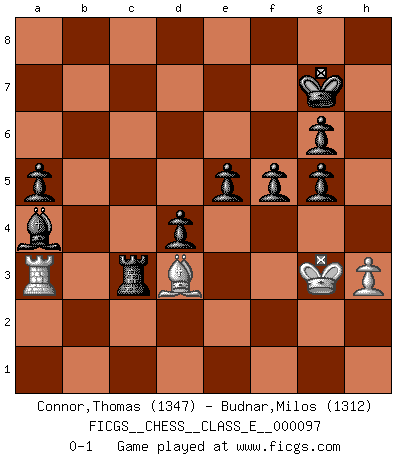 Last move : 0-1 2008 December 30 21:46:31 [Event "FICGS__CHESS__CLASS_E__000097"] [Site "FICGS"] [Date "2008.11.22"] [Round "1"] [White "Connor,Thomas"] [Black "Budnar,Milos"] [Result "0-1"] [WhiteElo "1347"] [BlackElo "1312"] 1.d4 d5 2.c4 e6 3.Nf3 Nf6 4.Nc3 Bb4 5.e3 c6 6.Bd3 dxc4 7.Bxc4 O-O 8.O-O c5 9.Ne5 cxd4 10.exd4 Nc6 11.Bg5 h6 12.Be3 Bxc3 13.bxc3 Ne4 14.f3 Nxc3 15.Qc2 Nd5 16.Qe4 Nxe3 17.Bd3 Nf5 18.g4 Qf6 19.gxf5 Qxf5 20.Qh4 Qg5+ 21.Qxg5 hxg5 22.Nxc6 bxc6 23.Rfc1 Bd7 24.Be4 Rac8 25.Rab1 Rc7 26.Kf2 f5 27.Bd3 g6 28.Kg3 Kg7 29.h3 Rh8 30.Rb2 Rh4 31.f4 Rxf4 32.Rc4 c5 33.a3 Rxd4 34.Rxd4 cxd4 35.Rb4 e5 36.a4 a5 37.Rb3 Bxa4 38.Ra3 Rc3 0-1 Queen's gambit declined Kingside Castling by player Black (move 7) Kingside Castling by player White (move 8) Player Black won this chess game. Follow this game move after move (download)A great player and a great example for many. His book My 60 Memorable Games had a big impact on me. It is a shame he didn't continue to enrich the world of chess with his unparalleled understanding after 1972. (Jan Timman, about Bobby Fischer's death) Karpov ist ein Museumsstück. (Garry Kasparov) La estratégia requiere pensar, la táctica requiere observación. (Max Euwe) On entre au jeu d'Echecs comme on entre en Religion. Pour le joueur d'Echecs, la partie d'Echecs c'est l'office, la messe, le défilé du 1er Mai, le dépôt de gerbe au Monument aux Morts. C'est un drame sacré. (Michel Roos) The leaves of memory seemed to make a mournful rustling in the dark. (Henry Wadsworth Longfellow)