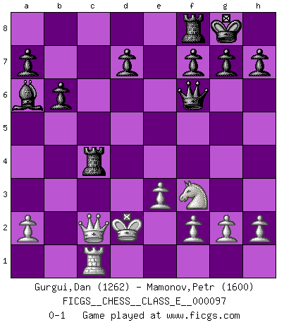 Last move : 0-1 2008 December 20 10:58:11 [Event "FICGS__CHESS__CLASS_E__000097"] [Site "FICGS"] [Date "2008.11.22"] [Round "1"] [White "Gurgui,Dan"] [Black "Mamonov,Petr"] [Result "0-1"] [WhiteElo "1262"] [BlackElo "1600"] 1.c4 e5 2.Nc3 Nf6 3.d4 exd4 4.Qxd4 Nc6 5.Qd1 Bb4 6.Bd2 O-O 7.Qb3 Qe7 8.O-O-O Na5 9.Qc2 Nxc4 10.e3 Nxd2 11.Rxd2 Bxc3 12.Qxc3 Ne4 13.Qxc7 Nxd2 14.Kxd2 Qb4+ 15.Kd1 Qxb2 16.Qc2 Qa1+ 17.Ke2 b6 18.Nf3 Ba6+ 19.Kd2 Rac8 20.Bc4 Qf6 21.Rc1 Rxc4 0-1 English Opening Kingside Castling by player Black (move 6) Queenside Castling by player White (move 8) Player Black won this chess game. Follow this game move after move (download)Chess teaches you to control the initial excitement you feel when you see something that looks good and it trains you to think objectively when you're in trouble. (Stanley Kubrick) Weshalb minderdergeübte Spieler mit g2-g4 beginnen? Die betreffenden sind unschlüssig, ob sie nun rechts (h4) oder links (f4) beginnen sollen, und in ihrer Ratlosigkeit entschliessen sie sich nach guter Bürgerart dazu, den goldenen Mittelweg zu wählen. (Aaron Nimzowitsch) Tu cuerpo tiene que estar en óptima condición. Tu Ajedrez se deteriora como lo hace tu cuerpo. No puedes separar la mente y el cuerpo. (Bobby Fischer) Aucun coup ne doit être joué sans but. (Pedro Damiano) Experience is the name we all give to our mistakes. (Oscar Wilde)