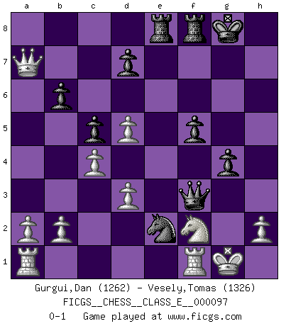Last move : 0-1 2008 December 19 7:25:13 [Event "FICGS__CHESS__CLASS_E__000097"] [Site "FICGS"] [Date "2008.11.22"] [Round "1"] [White "Gurgui,Dan"] [Black "Vesely,Tomas"] [Result "0-1"] [WhiteElo "1262"] [BlackElo "1326"] 1.c4 c5 2.Nc3 Nc6 3.e4 e5 4.Nf3 b6 5.Nd5 Bd6 6.Be2 Nf6 7.d3 Bb7 8.Bg5 Be7 9.O-O Nd4 10.Nxe5 Bxd5 11.exd5 O-O 12.Bg4 Nxg4 13.Nxg4 Bxg5 14.f4 h5 15.fxg5 Qxg5 16.Nf2 f5 17.Nh3 Qe3+ 18.Kh1 h4 19.Nf4 Rae8 20.Qa4 g5 21.Nh3 g4 22.Nf2 h3 23.Qxa7 hxg2+ 24.Kxg2 Qf3+ 25.Kg1 Ne2+ 0-1 English : Symmetrical variation Kingside Castling by player White (move 9) Kingside Castling by player Black (move 11) Player Black won this chess game. Follow this game move after move (download)A strong memory, concentration, imagination, and a strong will is required to become a great Chess player. (Bobby Fischer) Frage: Was machen Sie mit den Preisen? Anwort: Ich habe Angst, dass meine Freundin davon neue Kleider kauft. (Loek van Wely) Bobby es el jugador de Ajedrez mas fino que este país jamás haya producido. Su memoria para las movidas, su brillantez en soñar combinaciones y su feróz determinación por la victoria son algo extraño. (John Collins) Les erreurs sont comme les malheurs, elles n'arrivent jamais seules. (Siegbert Tarrasch) But they are useless. They can only give you answers. (Pablo Picasso, about computers)