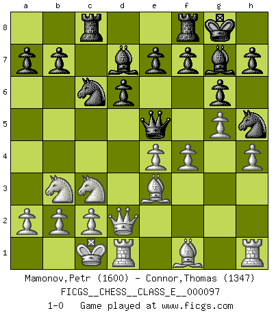 Last move : 1-0 2008 December 23 10:43:25 [Event "FICGS__CHESS__CLASS_E__000097"] [Site "FICGS"] [Date "2008.11.22"] [Round "1"] [White "Mamonov,Petr"] [Black "Connor,Thomas"] [Result "1-0"] [WhiteElo "1600"] [BlackElo "1347"] 1.e4 c5 2.Nf3 d6 3.d4 cxd4 4.Nxd4 Nf6 5.Nc3 g6 6.Be3 Bg7 7.f3 O-O 8.Qd2 Nc6 9.O-O-O Bd7 10.g4 Rc8 11.h4 Qa5 12.Nb3 Qe5 13.g5 Nh5 14.f4 1-0 Sicilian : Dragon, Yugoslav attack, 7...O-O Kingside Castling by player Black (move 7) Queenside Castling by player White (move 9) Player White won this chess game. Follow this game move after move (download)The stomach is an essential part of the Chess master. (Bent Larsen) Im Wettkampf zwischen starken Meistern kommen Fehler sehr selten vor, deshalb ist es mit bloßem Warten nicht getan. (José Raúl Capablanca) No volvere nunca a jugar contigo. Has insultado a mi amigo. - cuando un oponente se maldijo por una mala jugada (Miguel Najdorf) Demandez au pauvre Cg1 ce qu'il en pense. Eduard Gufeld à propos de la variante Saemisch de l'Est-Indienne. Life is verb, not a noun. (Charlotte Perkins Gilman)