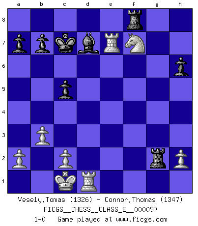 Last move : 1-0 2008 December 17 11:17:4 [Event "FICGS__CHESS__CLASS_E__000097"] [Site "FICGS"] [Date "2008.11.22"] [Round "1"] [White "Vesely,Tomas"] [Black "Connor,Thomas"] [Result "1-0"] [WhiteElo "1326"] [BlackElo "1347"] 1.e4 c5 2.d4 d6 3.d5 e6 4.dxe6 Bxe6 5.Nc3 Nf6 6.e5 dxe5 7.Qxd8+ Kxd8 8.Bg5 Be7 9.O-O-O Nbd7 10.Bb5 Kc7 11.f4 h6 12.Bxf6 Bxf6 13.Nd5+ Kd8 14.Nxf6 gxf6 15.fxe5 fxe5 16.Nf3 Kc7 17.b3 Rhg8 18.Rhe1 Rad8 19.Bxd7 Bxd7 20.Nxe5 Rxg2 21.Nxf7 Rf8 22.Re7 1-0 Sicilian : Smith-Morra gambit Queenside Castling by player White (move 9) Player White won this chess game. Follow this game move after move (download)Chess, like any creative activity, can exist only through the combined efforts of those who have creative talent, and those who have the ability to organize their creative work. (Mikhail Botvinnik) Frage des Reporters: -Worin besteht das Ziel von Gambiteröffnungen? Antwort: -Auf Kosten der Partie einen Ruf als Angriffspieler zu erwerben.- (Siegbert Tarrasch) Hay jugadores fuertes y personas amables y yo soy un jugador fuerte. (Bobby Fischer) Pour se monter efficace, un Cavalier a besoin d'avant-postes ! Les Cavaliers font les meilleurs bloqueurs de pions passés. Man with more than one clock never knows what time it is. (Chinese thought)
