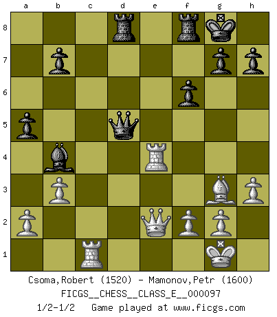 Last move : 1/2-1/2 2009 April 3 10:2:54 [Event "FICGS__CHESS__CLASS_E__000097"] [Site "FICGS"] [Date "2008.11.22"] [Round "1"] [White "Csoma,Robert"] [Black "Mamonov,Petr"] [Result "1/2-1/2"] [WhiteElo "1520"] [BlackElo "1600"] 1.d4 d5 2.Bf4 Nf6 3.Nf3 c5 4.e3 Nc6 5.Be2 Qb6 6.b3 cxd4 7.exd4 Bg4 8.c3 e6 9.O-O Be7 10.h3 Bh5 11.Nbd2 Bg6 12.Ne5 Nxe5 13.Bxe5 O-O 14.c4 Ne4 15.Nxe4 Bxe4 16.Bd3 f6 17.Bg3 Qxd4 18.Bxe4 Qxe4 19.Re1 Qf5 20.cxd5 Bb4 21.Rxe6 Rad8 22.Qe2 Qxd5 23.Re4 a5 24.Rc1 1/2-1/2 Queen's pawn, Mason variation Kingside Castling by player White (move 9) Kingside Castling by player Black (move 13) This chess game ended in a draw. Follow this game move after move (download)You must take your opponent into a deep dark forest where 2+2=5, and the path leading out is only wide enough for one. (Mikhail Tal) Schach ist das schnellste Spiel der Welt, weil man in jeder Sekunde Tausende von Gedanken ordnen muß. (Albert Einstein) El Ajedrez es como la guerra en un tablero. (Bobby Fischer) Avant la finale, les dieux ont créé le milieu de partie. (Tarrasch) In my experience, there's no such thing as luck. (Obi-Wan Kenobi in Star Wars ep.4)
