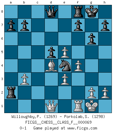 Last move : 0-1 2009 January 10 13:52:23 [Event "FICGS__CHESS__CLASS_F__000069"] [Site "FICGS"] [Date "2008.11.22"] [Round "1"] [White "Willoughby,Peter"] [Black "Porkolab,Sandor"] [Result "0-1"] [WhiteElo "1269"] [BlackElo "1298"] 1.d4 Nf6 2.Nf3 d5 3.e3 c6 4.Bd3 e6 5.O-O Nbd7 6.Nbd2 Bd6 7.b3 e5 8.Bb2 e4 9.Bxe4 Nxe4 10.c4 Ndf6 11.cxd5 cxd5 12.Ne5 Nxd2 13.Qxd2 O-O 14.f4 Ne4 15.Qe1 Bxe5 16.dxe5 g6 17.Rc1 Be6 18.Rf3 Rc8 19.Rd1 Rc2 20.Bd4 Bg4 21.Rf1 Bxd1 22.Qxd1 Rxa2 0-1 Queen's pawn game Kingside Castling by player White (move 5) Kingside Castling by player Black (move 13) Player Black won this chess game. Follow this game move after move (download)Bobby is the finest Chess player this country ever produced. His memory for the moves, his brilliance in dreaming up combinations, and his fierce determination to win are uncanny. (John Collins) Schach ist Krieg, im Schach geht es um testosterongesteuerte Urschreie. (Garry Kasparov) Del Ajedrez se ha dicho que la vida no es lo suficientemente larga para él, pero eso es culpa de la vida, no del Ajedrez. (William Ewart Napier) Ce n'est pas pour s'amuser qu'il joue aux échecs : il célèbre un culte. (Vladimir Nabokov) Games, world of games... There's always an opponent, and there's always a victim. (Revolver, movie)