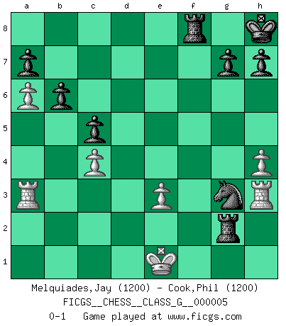 Last move : 0-1 2006 September 1 1:14:27 [Event "FICGS__CHESS__CLASS_G__000005"] [Site "FICGS"] [Date "2006.08.21"] [Round "1"] [White "Melquiades,Jay"] [Black "Cook,Phil"] [Result "0-1"] [WhiteElo "1200"] [BlackElo "1200"] 1.e4 e5 2.Nf3 Nf6 3.Nc3 Bb4 4.a3 Bxc3 5.bxc3 O-O 6.Nxe5 d6 7.d4 dxe5 8.dxe5 Qxd1+ 9.Kxd1 Nxe4 10.Be3 Nxc3+ 11.Kd2 Nd5 12.Bc4 Nxe3 13.fxe3 c6 14.a4 Nd7 15.e6 fxe6 16.Bxe6+ Kh8 17.a5 Nc5 18.Bc4 Be6 19.Bxe6 Nxe6 20.a6 Rad8+ 21.Ke2 b6 22.c4 Nc5 23.h4 Ne4 24.Rh3 Rd2+ 25.Ke1 Rxg2 26.Ra4 c5 27.Ra3 Ng3 0-1 Petrov Three knights game Kingside Castling by player Black (move 5) Player Black won this chess game. Follow this game move after move (download)Mistrust is the most necessary characteristic of the Chess player. (Siegbert Tarrasch) Der Umstand, daß uns eine 7 Stunden Zeitkontrolle ermöglicht eine großartige, tiefe Partie zu spielen, ist für die Massenmedien nicht weiter von Bedeutung. (Alexej Shirov) Después de la respuesta de las negras a 1.e4 con 1..e5, se quedan siempre tratando de entrar dentro del juego. (Howard Staunton) Vous n'êtes pas toujours obligé de jouer le meilleur coup. Un coup doit être actif, entreprenant, correct et beau ! (David Bronstein) Plans are ideas that never come to fruition. (Daniel Parmet)