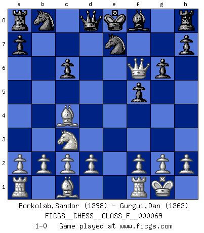 Last move : 1-0 2009 January 4 10:15:47 [Event "FICGS__CHESS__CLASS_F__000069"] [Site "FICGS"] [Date "2008.11.22"] [Round "1"] [White "Porkolab,Sandor"] [Black "Gurgui,Dan"] [Result "1-0"] [WhiteElo "1298"] [BlackElo "1262"] 1.e4 e5 2.Nf3 f5 3.Nxe5 Nf6 4.Bc4 d5 5.exd5 Nxd5 6.O-O g6 7.Nc3 Be6 8.Qe1 c6 9.Nxc6 bxc6 10.Qxe6+ Ne7 11.Qf6 1-0 Latvian counter-gambit Kingside Castling by player White (move 6) Player White won this chess game. Follow this game move after move (download)A passed Pawn increases in strength as the number of pieces on the board diminishes. (Capablanca) Ich bin stolz ein Bulgare zu sein. (Veselin Topalov) Una de estas pequeñas movidas modestas pudieran ser mas molestas a tu oponente que la amenaza mas grande. (Siegbert Tarrasch) Aidez vos pièces, elles vous aideront. (Paul Morphy) The beginning is the most important part of the work. (Plato)