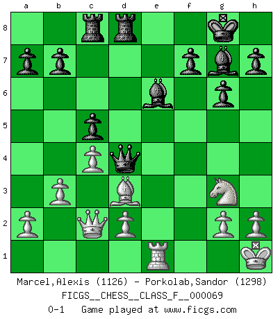 Last move : 0-1 2009 January 3 19:51:33 [Event "FICGS__CHESS__CLASS_F__000069"] [Site "FICGS"] [Date "2008.11.22"] [Round "1"] [White "Marcel,Alexis"] [Black "Porkolab,Sandor"] [Result "0-1"] [WhiteElo "1126"] [BlackElo "1298"] 1.f4 d5 2.Nf3 c5 3.e3 Nc6 4.Be2 g6 5.O-O Bg7 6.c3 Nh6 7.b3 O-O 8.Bb2 Nf5 9.Qc2 e5 10.fxe5 Nxe5 11.Nxe5 Bxe5 12.c4 d4 13.exd4 Nxd4 14.Bxd4 Bxd4+ 15.Kh1 Bxa1 16.Bd3 Bg7 17.Nc3 Be6 18.Ne4 Rc8 19.Re1 Qd4 20.Ng3 Rfd8 0-1 Bird's Opening Kingside Castling by player White (move 5) Kingside Castling by player Black (move 7) Player Black won this chess game. Follow this game move after move (download)Chess is a terrific way for kids to build self image and self esteem. (Saudin Robovic) Wir können eben der zündenden Macht des Opfers nicht wiederstehen, denn die Begeisterung für das Opfer liegt in der Natur des Menschen. (Rudolf Spielmann) Realmente no sabemos como el juego fue inventado, aunque hay sospechas. Tan pronto como descubramos a los culpables, se los haremos saber. (Bruce Pandolfini) Les écrivains ont utilisé les échecs pour analyser les côtés extrêmes de la nature humaine. Dans ce cadre, les échecs offrent un champ d'expérimentation idéal. Mais on pourrait faire la même chose avec la peinture. Et là, en vous référant à Van Gogh, vous ne tirerez pas de conclusion définitive sur les peintres. (Gary Kasparov) Life is like a ten-speed bicycle: most of us have gears we never use. (Charles M. Schulz)