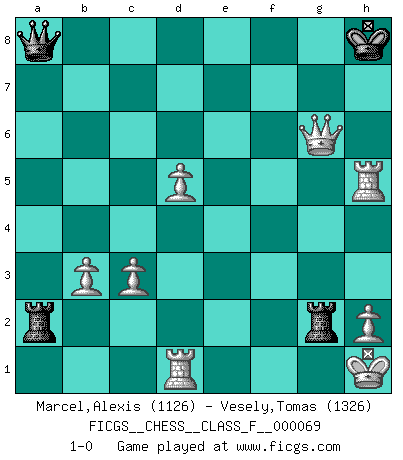 Last move : 1-0 2008 November 26 12:28:26 [Event "FICGS__CHESS__CLASS_F__000069"] [Site "FICGS"] [Date "2008.11.22"] [Round "1"] [White "Marcel,Alexis"] [Black "Vesely,Tomas"] [Result "1-0"] [WhiteElo "1126"] [BlackElo "1326"] 1.f4 c5 2.Nf3 d5 3.e3 Bf5 4.Be2 Nc6 5.O-O Nf6 6.b3 e6 7.Bb2 Be7 8.Nh4 d4 9.Nxf5 exf5 10.exd4 cxd4 11.Bb5 O-O 12.c3 d3 13.Qf3 Ne4 14.Bxd3 Bc5+ 15.Kh1 Re8 16.Bxe4 Rxe4 17.d4 Bb6 18.Nd2 Re7 19.Nc4 Bc7 20.Ne5 Nxe5 21.fxe5 g6 22.Ba3 Re8 23.Qxb7 h5 24.Bc5 Kg7 25.Qf3 Qg5 26.Qf4 Qd8 27.Rad1 Bb6 28.Bxb6 axb6 29.d5 Rxa2 30.e6 Qa8 31.exf7 Kxf7 32.Qc7+ Kg8 33.Qxb6 R8e2 34.Qxg6+ Kh8 35.Rxf5 Rxg2 36.Rxh5+ 1-0 Bird's Opening Kingside Castling by player White (move 5) Kingside Castling by player Black (move 11) Player White won this chess game. Follow this game move after move (download)Chess, like love, like music, has the power to make people happy. (Siegbert Tarrasch) Ich verachte die Medien. (Robert James Fischer) Morphy probablemente fue el genio más grande de todos. (Bobby Fischer) Toutes les manuvres exécutées sur une colonne ouverte ont pour but ultime l'intrusion définitive sur la septième ou la huitième rangée, en plein cur de la position ennemie. (Aaron Nimzovitch) There's no money in correspondence chess. (John Knudsen)