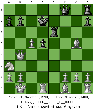 Last move : 1-0 2009 February 16 5:15:9 [Event "FICGS__CHESS__CLASS_F__000069"] [Site "FICGS"] [Date "2008.11.22"] [Round "1"] [White "Porkolab,Sandor"] [Black "Toro,Simone"] [Result "1-0"] [WhiteElo "1298"] [BlackElo "1400"] 1.e4 e5 2.d4 exd4 3.Qxd4 Nc6 4.Qe3 Nb4 5.Na3 Be7 6.Nf3 d5 7.e5 Be6 8.c3 d4 9.Nxd4 Nd5 10.Qg3 Nh6 11.Qxg7 Kd7 12.Qxh6 Bc5 13.Nxe6 fxe6 14.c4 Nb4 15.Bg5 Qf8 16.O-O-O Kc6 17.Qxe6+ Bd6 18.exd6 cxd6 19.Qe4+ Kd7 20.Kb1 Re8 21.Qg4+ Re6 22.c5 d5 23.Qxb4 1-0 Centre game : Paulsen attack Queenside Castling by player White (move 16) Player White won this chess game. Follow this game move after move (download)Chess is above all, a fight ! (Emanuel Lasker) Ich suche im Schach immer etwas Eigenes. Riskantes Spiel im Stile schachlicher Musketiere ist nicht meine Sache, auch wenn es vielen Freunden scharfer Wendungen gefällt. (Anatoly Karpov) Si yo gano un torneo, yo lo gano por mí mismo. Yo hago las jugadas. Nadie me ayuda. (Bobby Fischer) Seul un grand joueur sait à quel point il joue faiblement. (Xavier Tartacover) No enterprise is more likely to succeed than one concealed from the enemy until it is ripe for execution. (Niccolo Machiavelli)