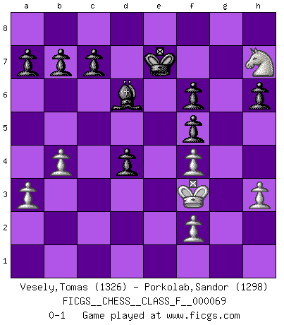 Last move : 0-1 2009 January 29 18:17:10 [Event "FICGS__CHESS__CLASS_F__000069"] [Site "FICGS"] [Date "2008.11.22"] [Round "1"] [White "Vesely,Tomas"] [Black "Porkolab,Sandor"] [Result "0-1"] [WhiteElo "1326"] [BlackElo "1298"] 1.e4 d5 2.exd5 Qxd5 3.Nc3 Qa5 4.Bc4 Nf6 5.Nf3 Bg4 6.h3 Bh5 7.O-O Nc6 8.d3 O-O-O 9.Bf4 Qf5 10.Bg3 e6 11.d4 Bxf3 12.Qxf3 Qxf3 13.gxf3 Nxd4 14.Kg2 Nxc2 15.Rad1 Bb4 16.Be5 Rxd1 17.Rxd1 Rd8 18.Rxd8+ Kxd8 19.Bxf6+ gxf6 20.Ne4 Ke7 21.Kg3 f5 22.Ng5 h6 23.Nh7 Bd6+ 24.f4 Nb4 25.a3 Nd5 26.Bxd5 exd5 27.Kf3 d4 28.b4 f6 0-1 Scandinavian (centre counter) defense Kingside Castling by player White (move 7) Queenside Castling by player Black (move 8) Player Black won this chess game. Follow this game move after move (download)Up to this point White has been following well-known analysis. But now he makes a fatal error: he begins to use his own head. (Siegbert Tarrasch) Es gibt Leute, die glauben, alles wäre vernünftig, was man mit einem ernsthaften Gesicht tut. (Georg Christoph Lichtenberg) El Peón aislado arroja penumbra sobre todo el tablero. (Aaron Nimzovich) Lorsque vous vous retrouvez devant une position atroce, ne tendez pas un ultime piège dérisoire avec l'intention d'abandonner si l'adversaire le déjoue ! Faites-vous plutôt un devoir de résister comme si votre vie en dépendait. Jouez le coup qui vous déplairait au centuple si vous étiez dans la peau de votre tortionnaire ! If you work for a living, why do you kill yourself working ? (Tuco to a chicken in The Good, The Bad and The Ugly)