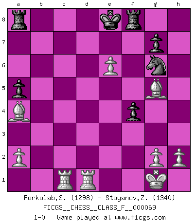 Last move : 1-0 2009 January 9 7:35:7 [Event "FICGS__CHESS__CLASS_F__000069"] [Site "FICGS"] [Date "2008.11.22"] [Round "1"] [White "Porkolab,Sandor"] [Black "Stoyanov,Zdravko"] [Result "1-0"] [WhiteElo "1298"] [BlackElo "1340"] 1.e4 c6 2.d4 e6 3.Nc3 d5 4.f3 dxe4 5.fxe4 Bb4 6.Nf3 Bxc3+ 7.bxc3 h6 8.Bd3 Ne7 9.O-O O-O 10.Qe1 Nd7 11.Qg3 Ng6 12.e5 f5 13.Qxg6 Qe8 14.Qg3 Nb6 15.Bxh6 Qf7 16.Bd2 Nd5 17.c4 Ne7 18.c3 Qh5 19.Qg5 Qxg5 20.Nxg5 Bd7 21.Nf3 Kf7 22.Rab1 b6 23.d5 exd5 24.cxd5 Nxd5 25.Bc4 Be6 26.Ng5+ Ke7 27.Nxe6 Kxe6 28.Rbe1 b5 29.Bb3 a5 30.c4 Ne7 31.cxb5 Kd7 32.bxc6+ Kxc6 33.Rc1+ Kd7 34.Bg5 Ng6 35.Rfd1+ Ke8 36.e6 f4 37.Ba4+ 1-0 Caro-Kann defense Kingside Castling by player White (move 9) Kingside Castling by player Black (move 9) Player White won this chess game. Follow this game move after move (download)When you absolutely don't know what to do anymore, it is time to panic. (John van der Wiel) Wenn Capablanka heute auf der Schachbühne erscheinen würde, hätte er ein halbes Jahr gebraucht um sich die Schachtheorie anzueignen. Und dann hätte er alles und jeden besiegt. (Mikhail Moiseyevich Botvinik) Peones: ellos son el alma de esta partida, solos forman el ataque y la defensa. (Philidor) Un footballeur joue avec ses pieds, parfois avec sa tête. Un joueur d'échecs ne joue qu'avec sa tête. Et quand il ne joue plus, il meurt. (Jacob Murray) I can't decide which is riskier; taking crazy risks, or taking advice on crazy risks from a crazy risk taker. (Gregory House in House M.D.)