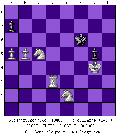 Last move : 1-0 2008 December 4 12:17:18 [Event "FICGS__CHESS__CLASS_F__000069"] [Site "FICGS"] [Date "2008.11.22"] [Round "1"] [White "Stoyanov,Zdravko"] [Black "Toro,Simone"] [Result "1-0"] [WhiteElo "1340"] [BlackElo "1400"] 1.e4 e5 2.Nf3 Nc6 3.Bb5 Nf6 4.Bxc6 bxc6 5.d3 d5 6.Bg5 Be7 7.Nxe5 dxe4 8.Nxc6 Qd6 9.Na5 Qd5 10.Bd2 O-O 11.O-O Bd6 12.Qe2 Bg4 13.f3 Qh5 14.g3 Qh3 15.fxg4 Nxg4 16.Bf4 Bc5+ 17.Kh1 Rfe8 18.Qg2 Qh5 19.Bxc7 Ne3 20.Qg1 Nxc2 21.Qg2 exd3 22.Nd2 Nxa1 23.Rxa1 Re2 24.g4 Qxh2+ 25.Bxh2 Rxg2 26.Kxg2 Re8 27.Nab3 Re2+ 28.Kh3 Be7 29.Bf4 h6 30.Rf1 g5 31.Bg3 Bb4 32.Be1 Bd6 33.Bg3 Re3 34.Nf3 Bxg3 35.Kxg3 Kg7 36.Rd1 Kg6 37.Nc5 f5 38.gxf5+ Kxf5 39.Rxd3 Re2 40.Nd4+ Kf6 41.Nxe2 h5 42.a4 Kf5 43.b4 h4+ 44.Kh3 Kg6 45.Kg4 Kf6 46.b5 h3 47.Rxh3 Ke5 48.Rd3 Kf6 49.a5 1-0 Ruy Lopez : Berlin defense Kingside Castling by player Black (move 10) Kingside Castling by player White (move 11) 10 pieces endgame at move 41 : White KRNNPP , Black KPPP WHITE : King + 1 Rook 2 Knights 2 Pawns BLACK : King + 3 Pawns 9 pieces endgame at move 47 : White KRNNPP , Black KPP WHITE : King + 1 Rook 2 Knights 2 Pawns BLACK : King + 2 Pawns Player White won this chess game. Follow this game move after move (download)The hallmark of the artist is simplicity. (Larry Evans) Kostenjuk hat keinen Sexappeal. (Loek van Wely) Debió haber existido una vez en que los hombres eran semidióses, de otra manera no hubiesen podido inventar el Ajedrez. (Gustav Schenk) Vouloir jouer aux échecs contre soi-même est aussi paradoxal que vouloir marcher sur son ombre. (Stefan Zweig) Knowledge will give you power, but character respect. (Bruce Lee)