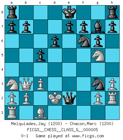 Last move : 0-1 2006 September 7 5:55:54 [Event "FICGS__CHESS__CLASS_G__000005"] [Site "FICGS"] [Date "2006.08.21"] [Round "1"] [White "Melquiades,Jay"] [Black "Chacon,Marc"] [Result "0-1"] [WhiteElo "1200"] [BlackElo "1200"] 1.e4 c5 2.c3 d6 3.h3 Nf6 4.Qa4+ Bd7 5.Bb5 Nc6 6.d3 Ne5 7.Na3 Nxd3+ 8.Kd2 Nxf2 9.Rh2 N2xe4+ 10.Ke1 Bxb5 11.Qxb5+ Qd7 12.Qb3 g6 13.Nf3 Bg7 14.Ng5 Qf5 15.Nf3 Ng3 16.Ng5 Qf1+ 17.Kd2 Qe2+ 0-1 Sicilian : Alapin's variation (2.c3) Player Black won this chess game. Follow this game move after move (download)He who fears an isolated Queen's Pawn should give up Chess. (Siegbert Tarrasch) Schach ist ein Teil der Kultur, und wenn es mit der Kultur abwärts geht, geht es auch mit dem Schach abwärts. (Mikhail Moiseyevich Botvinik) El Ajedrez te enseña a controlarl la excitación inicial que sientes cuando vez algo que parece bueno y te enseña a pensar objetivamente cuando te encuentras en problemas. (Stanley Kubrick) Que feriez-vous si vous étiez en train de jouer aux échecs et que la fin du monde arrive ? Je continuerais à jouer. (Saint Borromée) CHESS, n. f. [echecs, Fr.] A nice and abstruse game, in which two sets of puppets are moved in opposition to each other. (Dr Samuel Johnson, A Dictionary Of The English Language, 1755)
