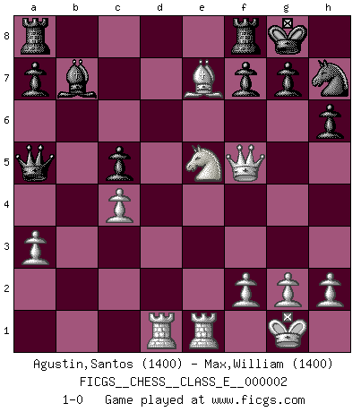 Last move : 1-0 2006 July 2 12:31:20 [Event "FICGS__CHESS__CLASS_E__000002"] [Site "FICGS"] [Date "2006.04.15"] [Round "1"] [White "Agustin,Santos"] [Black "Max,William"] [Result "1-0"] [WhiteElo "1400"] [BlackElo "1400"] 1.d4 Nf6 2.c4 e6 3.Nc3 Bb4 4.a3 Bxc3+ 5.bxc3 b6 6.Nf3 Bb7 7.Bg5 O-O 8.e3 h6 9.Bh4 d6 10.Bd3 Nbd7 11.O-O c5 12.Re1 Qc7 13.e4 d5 14.Bg3 Qc6 15.cxd5 exd5 16.exd5 Nxd5 17.Qc2 N7f6 18.Ne5 Qc8 19.Bf5 Qd8 20.dxc5 bxc5 21.Rad1 Qa5 22.c4 Ne7 23.Bh4 Nxf5 24.Qxf5 Nh7 25.Be7 1-0 Nimzo-Indian : Saemisch variation Kingside Castling by player Black (move 7) Kingside Castling by player White (move 11) Player White won this chess game. Follow this game move after move (download)The isolated Pawn casts gloom over the entire chessboard. (Aaron Nimzovich) Ohne Fehler kann es keine Brillanz geben. (Emanuel Lasker) Las leyes del Ajedrez no permiten una libre elección: tienes que mover quieras o no. (Emanuel Lasker) Il n'y a plus de joueurs du niveau de Jacob Murray dont la seule quête est le beau jeu, le plaisir de voir les pièces construire quelque chose. Sur 10 idées à la minute, 9 seront sans intérêt, la dernière s'avèrera géniale. (Christian Bauer) Never was anything great achieved without danger. (Niccolo Machiavelli)