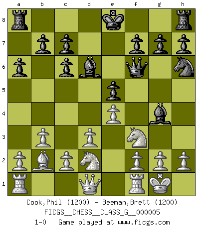 Last move : 1-0 2006 October 3 10:43:1 [Event "FICGS__CHESS__CLASS_G__000005"] [Site "FICGS"] [Date "2006.08.21"] [Round "1"] [White "Cook,Phil"] [Black "Beeman,Brett"] [Result "1-0"] [WhiteElo "1200"] [BlackElo "1200"] 1.e4 e5 2.Nf3 Nc6 3.Bb5 a6 4.Bxc6 dxc6 5.O-O Bd6 6.b3 Bg4 7.Bb2 Qf6 8.d3 Nh6 9.Nbd2 1-0 This chess game has been lost on time (started : 2006.08.21 8:28:56) Ruy Lopez : Exchange variation, 5.O-O Kingside Castling by player White (move 5) Player White won this chess game. Follow this game move after move (download)If a ruler does not understand Chess, how can he rule over a kingdom ? (King Khusros II) Das Blackmar-Diemer-Gambit verändert den ganzen Menschen! (Emil Joseph Diemer) Realmente no sabemos como el juego fue inventado, aunque hay sospechas. Tan pronto como descubramos a los culpables, se los haremos saber. (Bruce Pandolfini) Les écrivains ont utilisé les échecs pour analyser les côtés extrêmes de la nature humaine. Dans ce cadre, les échecs offrent un champ d'expérimentation idéal. Mais on pourrait faire la même chose avec la peinture. Et là, en vous référant à Van Gogh, vous ne tirerez pas de conclusion définitive sur les peintres. (Gary Kasparov) It is not enough to be a good player... you must also play well. (Siegbert Tarrasch)