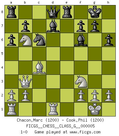 Last move : 1-0 2006 September 15 12:6:46 [Event "FICGS__CHESS__CLASS_G__000005"] [Site "FICGS"] [Date "2006.08.21"] [Round "1"] [White "Chacon,Marc"] [Black "Cook,Phil"] [Result "1-0"] [WhiteElo "1200"] [BlackElo "1200"] 1.d4 Nf6 2.c4 e6 3.Nf3 c5 4.Bg5 h6 5.Bh4 Be7 6.e3 Nc6 7.Bd3 O-O 8.O-O Re8 9.Nc3 d5 10.Bxf6 Bxf6 11.cxd5 exd5 12.Bb5 a6 13.Be2 Qb6 14.Nxd5 Qd8 15.Qb3 cxd4 16.Bc4 dxe3 17.Nxe3 Qc7 18.Nd5 Qd8 19.Rfd1 Bd7 20.Nb6 1-0 Queen's pawn game Kingside Castling by player Black (move 7) Kingside Castling by player White (move 8) Player White won this chess game. Follow this game move after move (download)In the perfect Chess combination as in a first-rate short story, the whole plot and counter-plot should lead up to a striking finale, the interest not being allayed until the very last moment. (Yates and Winter) Der Schachmeister von Heute braucht Courage, einen Killerinstinkt, Ausdauer und Arroganz. (Larry Evans) De todos mis libros Rusos, la defensa contiene y difunde el 'calor' mas grande que pudiese verse extraño al observar lo supremamente abstracto que el Ajedrez supuestamente es. (Vladimir Nabokov) Les ravages du H expliquent la différence de niveau entre Tal et Thal [Abergel]. When you have everything, sometimes it feels like nothing. (Horatio Caine, C.S.I. Miami)