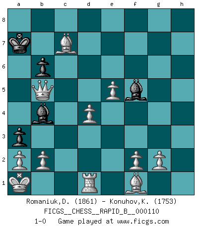 Last move : 1-0 2009 January 23 11:0:44 [Event "FICGS__CHESS__RAPID_B__000110"] [Site "FICGS"] [Date "2008.11.25"] [Round "1"] [White "Romaniuk,Dmytro"] [Black "Konuhov,Konstantin"] [Result "1-0"] [WhiteElo "1861"] [BlackElo "1753"] 1.d4 Nf6 2.c4 d5 3.cxd5 Nxd5 4.e4 Nb6 5.Nc3 e6 6.Nf3 N8d7 7.Be3 Bd6 8.Qc2 O-O 9.e5 Bb4 10.Ng5 g6 11.O-O-O a5 12.h4 Nd5 13.Nxd5 exd5 14.h5 a4 15.hxg6 hxg6 16.Nxf7 Rxf7 17.Qxg6+ Kf8 18.Rh8+ Ke7 19.Bg5+ Nf6 20.Bxf6+ Kd7 21.Rxd8+ Kc6 22.Qxf7 b6 23.Kb1 Kb7 24.Qxd5+ Ka7 25.Qb5 Bf5+ 26.Ka1 Rxd8 27.Bxd8 a3 28.Bxc7 1-0 Queen's pawn game Kingside Castling by player Black (move 8) Queenside Castling by player White (move 11) Player White won this chess game. Follow this game move after move (download)I'd rather have a Pawn than a finger. (Reuben Fine) Bis zum Jahr 1971 verlief in meiner Schachkariere alles glatt. Dieses dramatische Match [Fischer-Taimanov 6:0] machte mein Leben zur Hölle. (Mark Taimanov) Hasta este punto, las blancas han seguido un análisis bien conocido. Pero ahora el hace un error fatal: empieza a usar su propia cabeza. (Siegbert Tarrasch) On croit qu'il y a plus de mauvais joueurs que de bons joueurs, c'est faux : Il y a autant de joueurs qui gagnent que de joueurs qui perdent. (Philippe Geluck) O divine art of subtlety and secrecy! Through you we learn to be invisible, through you inaudible and hence we can hold the enemy's fate in our hands. (Sun Tzu)