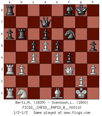 Last move : 1/2-1/2 2009 April 14 8:38:41 [Event "FICGS__CHESS__RAPID_B__000110"] [Site "FICGS"] [Date "2008.11.25"] [Round "1"] [White "Berti,Massimiliano"] [Black "Svensson,Leif"] [Result "1/2-1/2"] [WhiteElo "1839"] [BlackElo "1800"] 1.d4 Nf6 2.Nf3 c5 3.d5 b5 4.Bg5 Ne4 5.Bh4 Bb7 6.a4 Qa5+ 7.Nbd2 bxa4 8.c3 Nxd2 9.Qxd2 d6 10.e4 Nd7 11.Qc2 g6 12.Rxa4 Qc7 13.Be2 Bh6 14.O-O Nb6 15.Bb5+ Kf8 16.Ra3 Kg7 17.Rfa1 Rhb8 18.Ra5 a6 19.Be2 Re8 20.Bg3 e5 21.b3 f5 22.c4 f4 23.Bh4 Kg8 24.Qd2 Nd7 25.Qc3 Bc8 26.Rb1 Rb8 27.R5a1 Bg7 28.Nd2 Rb6 29.Bg4 Nf6 30.Bxc8 Rxc8 31.f3 h6 32.Be1 g5 33.Ra5 Qb7 34.Rba1 Ra8 35.Qd3 h5 36.R5a3 g4 37.Qe2 Qd7 38.Nb1 gxf3 39.Qxf3 Bf8 40.h3 1/2-1/2 Queen's pawn game Kingside Castling by player White (move 14) This chess game ended in a draw. Follow this game move after move (download)All my games are real. (Bobby Fischer) Ich war schon mal beim Dopingtest. Da musste ich Urin abgeben, während Dritte zusahen. (Elisabeth Pähtz) Fischer deseaba darle a los Rusos una sopa de su propia medicina. (Larry Evans) A chaque perte on perd un peu de soi. (Joël Lautier) They misunderestimated me. (George W. Bush, Bentonville nov. 6, 2000)