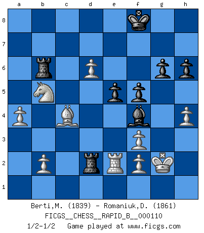 Last move : 1/2-1/2 2009 March 12 21:33:45 [Event "FICGS__CHESS__RAPID_B__000110"] [Site "FICGS"] [Date "2008.11.25"] [Round "1"] [White "Berti,Massimiliano"] [Black "Romaniuk,Dmytro"] [Result "1/2-1/2"] [WhiteElo "1839"] [BlackElo "1861"] 1.d4 Nf6 2.c4 g6 3.Nc3 d5 4.Bf4 Bg7 5.Nf3 O-O 6.Rc1 dxc4 7.e4 Bg4 8.Bxc4 Nh5 9.Be3 e5 10.d5 Nf4 11.O-O Qf6 12.Nb5 Na6 13.Nxa7 Rfd8 14.Re1 Nb4 15.Nb5 c6 16.Bxf4 Qxf4 17.Nc3 b5 18.Bb3 Bxf3 19.Qxf3 Qxf3 20.gxf3 cxd5 21.exd5 Nd3 22.Nxb5 Bh6 23.Rcd1 Nxe1 24.Rxe1 Bf4 25.Kg2 Kf8 26.d6 Rac8 27.a4 Rc1 28.Re4 Rb8 29.h4 h6 30.Re2 Rb6 31.Bd5 Rc5 32.Be4 f5 33.Bd3 Rd5 34.Bc4 Rd2 1/2-1/2 King's Indian defense, 3.Nc3 Kingside Castling by player Black (move 5) Kingside Castling by player White (move 11) This chess game ended in a draw. Follow this game move after move (download)The tactician must know what to do whenever something needs doing; the strategist must know what to do when nothing needs doing. (Savielly Tartakover) Was ist der Unterschied zwischen einem Strassenarbeiter und einem Schachspieler? --Der Schachspieler bewegt sich ab und zu. (Anonymous) El Jaque al descubierto es el bombardero del tablero. (Reuben Fine) Soyez une menace à chaque fois que vous vous asseyez pour jouer. (Ken Smith) As a goal marker shodan is important. As a destination it is a poor place to stop. (Thomas Tamayo)