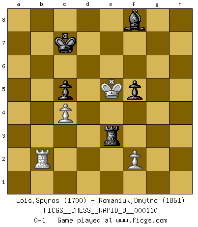 Last move : 0-1 2009 March 24 19:27:12 [Event "FICGS__CHESS__RAPID_B__000110"] [Site "FICGS"] [Date "2008.11.25"] [Round "1"] [White "Lois,Spyros"] [Black "Romaniuk,Dmytro"] [Result "0-1"] [WhiteElo "1700"] [BlackElo "1861"] 1.e4 c6 2.d4 d5 3.Nc3 dxe4 4.Nxe4 Nd7 5.Nf3 Ngf6 6.Ng3 Nb6 7.Bd3 Bg4 8.c3 Qd5 9.a4 a5 10.O-O Bxf3 11.gxf3 Qd7 12.Ne4 Nbd5 13.Bg5 O-O-O 14.Qe2 h6 15.Bd2 Nh5 16.Rfc1 Nhf4 17.Qf1 g5 18.Re1 Nxd3 19.Qxd3 Rg8 20.Kh1 Qh3 21.Rg1 e5 22.Ng3 Rg6 23.dxe5 Nf4 24.Qc2 Nd3 25.Be3 Nxe5 26.Rad1 Rxd1 27.Rxd1 Nxf3 28.Qf5+ Qxf5 29.Nxf5 Kc7 30.Kg2 Rf6 31.Kxf3 Rxf5+ 32.Kg4 Re5 33.Kh5 c5 34.h4 gxh4 35.Kxh4 Re4+ 36.Kg3 Rxa4 37.Bf4+ Kc8 38.Rd5 Be7 39.Bxh6 b6 40.Kf3 Kc7 41.Bf4+ Kc6 42.Rh5 Ra2 43.Bc1 Ra1 44.Rh6+ Kd7 45.Bd2 Rd1 46.Bf4 f6 47.Rh5 Re1 48.Rd5+ Ke6 49.c4 b5 50.Rd2 b4 51.b3 Ra1 52.Re2+ Kf7 53.Ke4 Ra3 54.Re3 a4 55.bxa4 Rxa4 56.Bg3 Ra3 57.Re2 Ke6 58.Kf4 Kd7 59.Rd2+ Ke8 60.Ke4 Rc3 61.Kd5 Kd7 62.Bf4 Bf8 63.Rd1 f5 64.Be3 b3 65.Rd2 b2 66.Ke5 Kc7 67.Rxb2 Rxe3+ 0-1 Caro-Kann : Steinitz variation Kingside Castling by player White (move 10) Queenside Castling by player Black (move 13) 10 pieces endgame at move 67 : White KRBPP , Black KRBPP WHITE : King + 1 Rook 1 Bishop 2 Pawns BLACK : King + 1 Rook 1 Bishop 2 Pawns 9 pieces endgame at move 67 : White KRPP , Black KRBPP WHITE : King + 1 Rook 2 Pawns BLACK : King + 1 Rook 1 Bishop 2 Pawns Player Black won this chess game. Follow this game move after move (download)I prefer to lose a really good game than to win a bad one. (David Levy) Charakterschwächen offenbaren sich normalerweise während einer Schachpartie. (Garry Kasparov) No hay precio que sea tan grande por la cabellera del Rey enemigo. (Koblentz) Mon pion favori sur ma case favorite ! Bronstein en parlant d'un coup de pion en h5 quand il avait les Noirs. Internet: Absolute communication, absolute isolation. (Paul Carvel)
