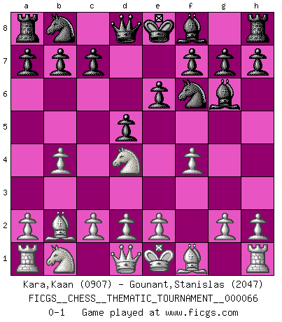 Last move : 0-1 2009 January 6 5:31:59 [Event "FICGS__CHESS__THEMATIC_TOURNAMENT__000066"] [Site "FICGS"] [Date "2008.11.25"] [Round "1"] [White "Kara,Kaan"] [Black "Gounant,Stanislas"] [Result "0-1"] [WhiteElo "0907"] [BlackElo "2047"] 1.b4 d5 2.Bb2 Nf6 3.Nf3 Bf5 4.Nd4 Bg6 5.f4 e6 0-1 This chess game has been lost on time (started : 2008.11.25 23:4:23) Polish (Sokolsky) opening Player Black won this chess game. Follow this game move after move (download)Tactics flow from a superior position. (Bobby Fischer) Die Arbeit ist etwas Unnatürliches. Die Faulheit allein ist göttlich. (Anatole France) En la vida, como en el Ajedrez, los Peones propios obstruyen nuestro camino. La gran fortuna de un hombre, su comodidad, placer, hijos, libros, que deberían ayudarle a ganar, con mucha frecuencia lo ponen en Jaque Mate. (Charles Buxton) Même si l'adversaire joue le coup analysé précédemment, recommencez l'analyse en voyant la nouvelle position. Première règle de Blumenfeld Beta. Software undergoes beta testing shortly before it's released. Beta is latin for still doesn't work. (Anonymous)