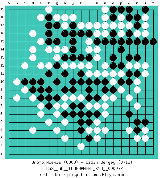 Last move : 0-1 2009 January 24 16:1:43 [Event "FICGS__GO__TOURNAMENT_KYU__000072"] [Site "FICGS"] [Date "2008.11.26"] [Round "1"] [Black "Bromo,Alexis"] [White "Uzdin,Sergey"] [Result "0-1"] [Rating 1 "0000"] [Rating 2 "0718"] 1.k16 d4 2.d10 q4 3.q16 d16 4.q10 o17 5.o16 n16 6.n15 p16 7.o15 q17 8.p15 p17 9.q15 r16 10.r15 q8 11.k4 d8 12.k10 h3 13.f16 d14 14.f15 m3 15.p10 c12 16.e10 b10 17.f13 f8 18.g10 h5 19.k5 m5 20.k6 h7 21.h9 o8 22.n10 m7 23.l9 r10 24.r11 r9 25.q11 c9 26.c10 k2 27.k7 e18 28.f18 l17 29.l16 s16 30.s15 k17 31.j16 m16 32.m15 g18 33.f17 f19 34.g17 h18 35.j17 j18 36.r17 s17 37.r18 s18 38.n17 m17 39.o18 n18 40.q18 p18 41.o19 s11 42.p19 n17 43.q19 r12 44.s19 n19 45.t15 q12 46.p12 e12 47.f11 f12 48.g12 p13 49.q13 s12 50.r13 j8 51.j7 h8 52.f9 k8 53.l8 l7 54.g8 g7 55.h6 g6 56.j6 g9 57.g5 g4 58.g8 f5 59.e8 g9 60.m8 e7 61.e9 h10 62.j9 n8 63.h11 o10 64.o9 o11 65.o12 n11 66.m12 m11 67.m10 p9 68.n9 n12 69.o13 l11 70.l10 p11 71.j10 k12 72.k11 m13 73.l13 l12 74.k13 j12 75.j13 f14 76.e14 g14 77.g15 g13 78.e13 e15 79.g8 h12 80.h13 d13 81.f7 e6 82.f8 h14 83.j14 h17 84.h16 l14 85.j15 m14 86.p14 l15 87.m6 n6 88.l6 n7 89.d9 b8 90.m4 n4 91.l5 l4 92.l3 m4 93.r4 r3 94.r5 s4 95.s5 s3 96.q6 r7 0-1 Here are the names of the openings (joseki) played in the four corners : Corner q16 : q16 o17 Hoshi (Hwajeom, Seongjeom, Xingwei`) 4-4 Point. The star or hoshi (4-4) point, emphasizing influence at the potential expense of territory. Ikken Kakari (Hankan Keolch'im, Yi Gua`jiao~, 1-Space Low Approach). White 2 is the standard approach move to the 4-4. Corner d16 : d16 f16 Hoshi (Hwajeom, Seongjeom, Xingwei`) 4-4 Point. The star or hoshi (4-4) point, emphasizing influence at the potential expense of territory. Ikken Takagakari (Hankan Nop'dakeolch'im, Yi Gaojia, 1-Space High Approach). White typically responds at 6-4 or 3-10. White 4-10 is played when White finds play on the right side advantageous. White 4-8 or 3-8 may be played when White has support at top. Player White won this Go (weiqi, baduk) game. Follow this game move after move (download)In the corner, five stones in a row on the third line are alive. (Anonymous) Political correctness is subjecting us to gross incompetence. (Johann Piek)