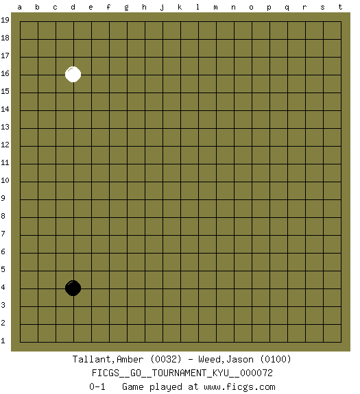 Last move : 0-1 2008 December 28 4:22:16 [Event "FICGS__GO__TOURNAMENT_KYU__000072"] [Site "FICGS"] [Date "2008.11.26"] [Round "1"] [Black "Tallant,Amber"] [White "Weed,Jason"] [Result "0-1"] [Rating 1 "0032"] [Rating 2 "0100"] 1.d4 d16 0-1 This go game has been lost on time (started : 2008.11.26 1:2:0) Here are the names of the openings (joseki) played in the four corners : Player White won this Go (weiqi, baduk) game. Follow this game move after move (download)You can hide nothing on the goban. (Pierre Audouard) Life is verb, not a noun. (Charlotte Perkins Gilman)