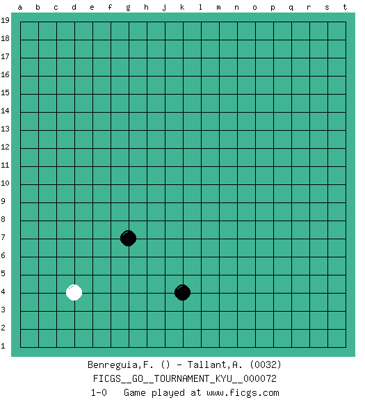 Last move : 1-0 2008 December 27 16:16:26 [Event "FICGS__GO__TOURNAMENT_KYU__000072"] [Site "FICGS"] [Date "2008.11.26"] [Round "1"] [Black "Benreguia,Frederic"] [White "Tallant,Amber"] [Result "1-0"] [Rating 2 "0032"] 1.g7 d4 2.k4 1-0 This go game has been lost on time (started : 2008.11.26 1:2:0) Here are the names of the openings (joseki) played in the four corners : Corner d4 : g7 d4 This joseki is unknown. A weak or weird move has probably been played in this corner. Player Black won this Go (weiqi, baduk) game. Follow this game move after move (download)Those who are good at winning, don't usually fight. (Zhang) The problem with manipulation is that people can turn on you. (Horatio Caine, C.S.I. Miami)