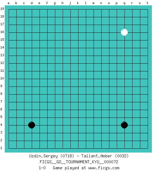 Last move : 1-0 2008 December 27 16:16:26 [Event "FICGS__GO__TOURNAMENT_KYU__000072"] [Site "FICGS"] [Date "2008.11.26"] [Round "1"] [Black "Uzdin,Sergey"] [White "Tallant,Amber"] [Result "1-0"] [Rating 1 "0718"] [Rating 2 "0032"] 1.d4 q16 2.q4 1-0 This go game has been lost on time (started : 2008.11.26 1:2:0) Here are the names of the openings (joseki) played in the four corners : Corner q4 : q4 1-0 Hoshi (Hwajeom, Seongjeom, Xingwei`) 4-4 Point. The star or hoshi (4-4) point, emphasizing influence at the potential expense of territory. Player Black won this Go (weiqi, baduk) game. Follow this game move after move (download)More haste less speed. (John Fairbairn) Nowadays, anyone who cannot speak English and is incapable of using the Internet is regarded as backward. (Al-Waleed bin Talal)
