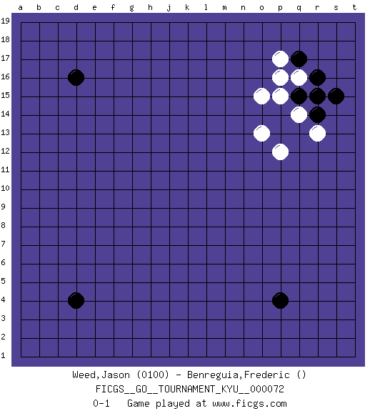 Last move : 0-1 2009 January 6 17:32:43 [Event "FICGS__GO__TOURNAMENT_KYU__000072"] [Site "FICGS"] [Date "2008.11.26"] [Round "1"] [Black "Weed,Jason"] [White "Benreguia,Frederic"] [Result "0-1"] [Rating 1 "0100"] 1.q15 o13 2.d4 o15 3.p4 q14 4.q17 q16 5.r16 p16 6.r14 p15 7.s15 r13 8.r15 p12 9.d16 p17 0-1 This go game has been lost on time (started : 2008.11.26 1:2:0) Here are the names of the openings (joseki) played in the four corners : Corner q16 : q15 o13 Takamoku (Gomok, Gaomu`) 5-4 Point. The takamoku (high) point (5-4). With its emphasis on influence, the 5-4 point complements the 4-4 (hoshi) point in creating an influence-oriented fuseki. Player White won this Go (weiqi, baduk) game. Follow this game move after move (download)In the corner, five stones in a row on the third line are alive. (Anonymous) We cannot be sure of having something to live for unless we are willing to die for it. (Ernesto Che Guevara)