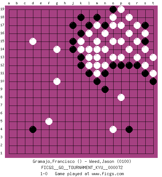 Last move : 1-0 2009 February 11 21:1:40 [Event "FICGS__GO__TOURNAMENT_KYU__000072"] [Site "FICGS"] [Date "2008.11.26"] [Round "1"] [Black "Gramajo,Francisco"] [White "Weed,Jason"] [Result "1-0"] [Rating 2 "0100"] 1.d4 d15 2.q4 q16 3.k16 f5 4.q15 p15 5.p16 r15 6.p14 q14 7.r14 p13 8.o14 p17 9.o16 r13 10.n15 s14 11.m16 p8 12.n13 l12 13.n17 g10 14.l17 l14 15.m18 k15 16.l15 k14 17.j17 o4 18.q17 q18 19.j15 n12 20.j14 g14 21.r16 r17 22.p18 o18 23.o19 p19 24.q12 o13 25.k13 l13 26.k12 m14 27.l11 n14 28.m12 o15 29.o12 m13 30.n11 m11 31.m10 m12 32.p12 m15 33.r12 n16 34.s13 s12 35.s15 s16 36.s17 t13 37.s11 l16 38.t12 t11 39.t10 m17 40.k18 o17 41.n9 1-0 This go game has been lost on time (started : 2008.11.26 1:2:0) Here are the names of the openings (joseki) played in the four corners : Corner d4 : d4 f5 Hoshi (Hwajeom, Seongjeom, Xingwei`) 4-4 Point. The star or hoshi (4-4) point, emphasizing influence at the potential expense of territory. Corner q16 : q16 q15 Hoshi (Hwajeom, Seongjeom, Xingwei`) 4-4 Point. The star or hoshi (4-4) point, emphasizing influence at the potential expense of territory. Corner q4 : q4 p8 Hoshi (Hwajeom, Seongjeom, Xingwei`) 4-4 Point. The star or hoshi (4-4) point, emphasizing influence at the potential expense of territory. Corner d16 : d15 j17 Takamoku (Gomok, Gaomu`) 5-4 Point. The takamoku (high) point (5-4). With its emphasis on influence, the 5-4 point complements the 4-4 (hoshi) point in creating an influence-oriented fuseki. Player Black won this Go (weiqi, baduk) game. Follow this game move after move (download)Keep inessential ataris till the end. (Anonymous) The quality of decision is like the well-timed swoop of a falcon which enables it to strike and destroy its victim. (Sun Tzu)