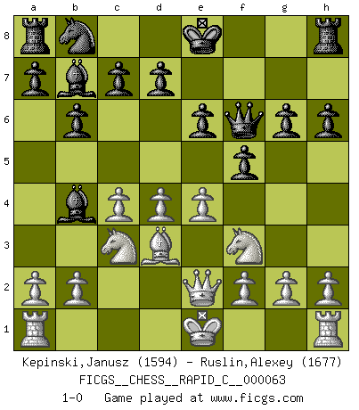 Last move : 1-0 2009 January 23 7:33:19 [Event "FICGS__CHESS__RAPID_C__000063"] [Site "FICGS"] [Date "2008.11.26"] [Round "1"] [White "Kepinski,Janusz"] [Black "Ruslin,Alexey"] [Result "1-0"] [WhiteElo "1594"] [BlackElo "1677"] 1.d4 e6 2.e4 b6 3.c4 Bb7 4.Nc3 Bb4 5.Bd3 f5 6.Qh5+ g6 7.Qe2 Nf6 8.Bg5 h6 9.Bxf6 Qxf6 10.Nf3 1-0 This chess game has been lost on time (started : 2008.11.26 4:36:30) Queen's pawn Player White won this chess game. Follow this game move after move (download)He who fears an isolated Queen's Pawn should give up Chess. (Siegbert Tarrasch) Als er Schachweltmeister wurde ließ er praktisch alle stärksten Sovietspieler für sich arbeiten. Wenn ein auch nur mittelmässiger Meister ein Spezialist für eine bestimmte Eröffnung war, wurde er von Karpov gerufen. Das wurde alles geheim gehalten. (Mikhail Moiseyevich Botvinik) El hombre es un frívolo, una creatura engañosa y como un jugador de Ajedrez, se preocupa mas por el proceso de obtener su meta que de la meta por sí misma. (Dostoyevsky) La solitude du joueur d'Echecs à l'approche du mat est semblable à celle du condamné. (Francis Szpiner) If you lose the game you should win the analysis! (Proverb)