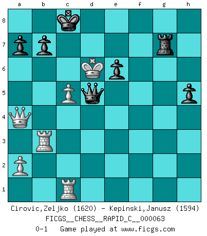 Last move : 0-1 2009 March 4 5:5:28 [Event "FICGS__CHESS__RAPID_C__000063"] [Site "FICGS"] [Date "2008.11.26"] [Round "1"] [White "Cirovic,Zeljko"] [Black "Kepinski,Janusz"] [Result "0-1"] [WhiteElo "1620"] [BlackElo "1594"] 1.e4 e6 2.d4 d5 3.Nc3 Nf6 4.e5 Ne4 5.Qg4 Nxc3 6.bxc3 c5 7.Bb5+ Bd7 8.Bxd7+ Qxd7 9.Nf3 Qa4 10.O-O h5 11.Qh4 Qxc2 12.Be3 Qxc3 13.dxc5 Nc6 14.Rfc1 Qd3 15.Rab1 Be7 16.Qg3 O-O-O 17.Qxg7 Qf5 18.Qg3 d4 19.Bxd4 Rhg8 20.Nh4 Bxh4 21.Qb3 Rd7 22.Be3 Qe4 23.g3 Qxe5 24.Qa4 Bxg3 25.hxg3 Rxg3+ 26.Kf1 Qf5 27.Rb3 Qh3+ 28.Ke2 Nd4+ 29.Bxd4 Qg4+ 30.f3 Rg2+ 31.Kd3 Qxf3+ 32.Kc4 Rxd4+ 33.Kxd4 Rg4+ 34.Ke5 Qd5+ 35.Kf6 Qg5+ 36.Kxf7 Qf5+ 37.Ke8 Rg8+ 38.Ke7 Rg7+ 39.Kd6 Qd5+ 0-1 French : Steinitz variation Kingside Castling by player White (move 10) Queenside Castling by player Black (move 16) Player Black won this chess game. Follow this game move after move (download)Fischer is completely natural. He plays no roles. He's like a child. Very, very simple. (Zita Rajcsanyi) Schach ist ein Reich, wo sich die menschliche Phantasie frei entfalten kann. (David Bronstein) Ciertamente el estado mental actual de Bobby Fischer es una tragedia. Uno de los mas grandes jugadores de Ajedrez del mundo -el orgullo y pena del Ajedrez Americano. (Frank Brady) Les échecs, c'est la lutte contre l'erreur. (Johannes Zukertort) Life is like a ten-speed bicycle: most of us have gears we never use. (Charles M. Schulz)