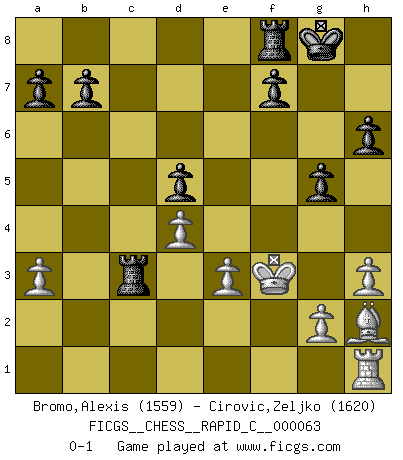 Last move : 0-1 2009 January 3 7:54:9 [Event "FICGS__CHESS__RAPID_C__000063"] [Site "FICGS"] [Date "2008.11.26"] [Round "1"] [White "Bromo,Alexis"] [Black "Cirovic,Zeljko"] [Result "0-1"] [WhiteElo "1559"] [BlackElo "1620"] 1.d4 d5 2.Nf3 Nf6 3.h3 e6 4.Nc3 c5 5.Bg5 cxd4 6.Nxd4 Bb4 7.a3 Bxc3+ 8.bxc3 Nc6 9.e3 Nxd4 10.cxd4 h6 11.Bh4 Qa5+ 12.Qd2 Qxd2+ 13.Kxd2 Ne4+ 14.Kd3 g5 15.Bg3 Bd7 16.c4 O-O 17.cxd5 exd5 18.Bh2 Nxf2+ 19.Kd2 Nxh1 20.Ke2 Bb5+ 21.Kf3 Bxf1 22.Rxf1 Rac8 23.Rxh1 Rc3 0-1 Queen's pawn game Kingside Castling by player Black (move 16) Player Black won this chess game. Follow this game move after move (download)Chess is so inspiring that I do not believe a good player is capable of having an evil thought during the game. (Wilhelm Steinitz) Der Knackpunkt bei der Konzentration ist, daß wir nur durch sie etwas Neues und Ungewöhnliches am Schachbrett finden können. Sie ist der einzige Weg durch neue neue Ideen eine Überraschung zu bereiten. (Garry Kasparov) EL Ajedrez es como la vida. (Boris Spassky) Un millionnaire : 'Monsieur Steinitz ! Vous ne participez aux tournois que pour l'argent, alors que moi je n'y viens que pour l'honneur.' Steinitz : 'Chacun joue pour ce qu'il n'a pas'... There's always a bigger fish. (Qui-Gon Jinn in Star Wars ep.1)