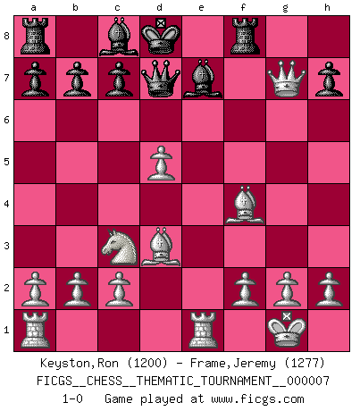 Last move : 1-0 2006 September 4 20:25:17 [Event "FICGS__CHESS__THEMATIC_TOURNAMENT__000007"] [Site "FICGS"] [Date "2006.08.21"] [Round "1"] [White "Keyston,Ron"] [Black "Frame,Jeremy"] [Result "1-0"] [WhiteElo "1200"] [BlackElo "1277"] 1.Nf3 Nf6 2.d4 Ng8 3.e4 Nf6 4.Nc3 Ng8 5.Bd3 d6 6.Qe2 e6 7.O-O Nc6 8.d5 exd5 9.exd5 Ne5 10.Nxe5 dxe5 11.Qxe5+ Qe7 12.Qg3 Nf6 13.Bg5 Qd6 14.Bf4 Qd7 15.Rfe1+ Be7 16.Qxg7 Rg8 17.Qxf6 Kd8 18.Qxf7 Rf8 19.Qg7 1-0 Reti Opening Kingside Castling by player White (move 7) Player White won this chess game. Follow this game move after move (download)Life is a kind of Chess, with struggle, competition, good and ill events. (Benjamin Franklin) Strategie ist, wie man ein Mädchen auf den Rücksitz bekommt. Taktik ist, was man tut, wenn man dann dort ist. (Anonymous) La señal de un Gran Maestro es su habilidad de ganar una partida rápidamente y sin dolor. (Irving Chernev) Ce n'est pas pour s'amuser qu'il joue aux échecs : il célèbre un culte. (Vladimir Nabokov) Games, world of games... There's always an opponent, and there's always a victim. (Revolver, movie)