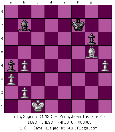 Last move : 1-0 2009 April 28 1:34:40 [Event "FICGS__CHESS__RAPID_C__000063"] [Site "FICGS"] [Date "2008.11.26"] [Round "1"] [White "Lois,Spyros"] [Black "Pech,Jaroslav"] [Result "1-0"] [WhiteElo "1700"] [BlackElo "1601"] 1.e4 c5 2.Nf3 d6 3.d4 cxd4 4.Nxd4 Nf6 5.Nc3 g6 6.Be3 Bg7 7.f3 O-O 8.Bc4 Nc6 9.Qd2 Bd7 10.O-O-O Rc8 11.Bb3 Ne5 12.h4 h5 13.Bg5 Rc5 14.Kb1 b5 15.g4 a5 16.gxh5 Nxh5 17.Nd5 Re8 18.a3 Nc4 19.Qf2 Kh7 20.Rhe1 a4 21.Ba2 Bc8 22.Rg1 Bb7 23.Nc3 Qa5 24.Bxc4 Rxc4 25.Na2 Kh8 26.Nb4 e6 27.Be3 Bf6 28.Ne2 Qc7 29.Nf4 Nxf4 30.Bxf4 Qc5 31.Qxc5 dxc5 32.Nd3 Rd4 33.Nxc5 Rxd1+ 34.Rxd1 Bc6 35.Bg5 Be5 36.Nd3 Bg7 37.Nb4 Ba8 38.Na6 Bc6 39.Rd6 Rc8 40.Nb4 Be8 41.Nd3 Kg8 42.Ra6 Bc6 43.Kc1 f6 44.Bf4 f5 45.Nb4 Ba8 46.Rxe6 fxe4 47.fxe4 Kf7 48.Rb6 Bxe4 49.Rxb5 Bf8 50.c3 Rc5 51.Rxc5 Bxc5 52.Na6 Be7 53.Bg5 Bb7 54.Nb4 Bxb4 55.cxb4 1-0 Sicilian : Dragon, Yugoslav attack, 7...O-O Kingside Castling by player Black (move 7) Queenside Castling by player White (move 10) 10 pieces endgame at move 55 : White KBPPPP , Black KBPP WHITE : King + 1 Bishop 4 Pawns BLACK : King + 1 Bishop 2 Pawns Player White won this chess game. Follow this game move after move (download)A chess genius has died; a loss for humanity. (Viktor Kortchnoi, about Bobby Fischer's death) Meine Liebe ist Schach, Schach, Schach. Ich muss jeden Tag Schach spielen, deshalb fühle ich mich so stark. (Miguel Najdorf) No soy una persona materialista y por eso, no resiento la falta o pérdida del dinero. La ausencia de cosas mundanas carece de importancia. Ya que el Ajedrez es una forma en la que puedo ser tan materialista como yo desee sin tener la necesidad de vender mi alma. (Jamie Walter Adams) Les échecs sont utiles à l'exercice de la faculté de penser et à celle de l'imagination. Car nous devons posséder une méthode élaborée pour atteindre des buts partout où nous devons conduire notre raison. (Leibnitz) Gambling is the son of avarice and the father of despair. (French proverb)